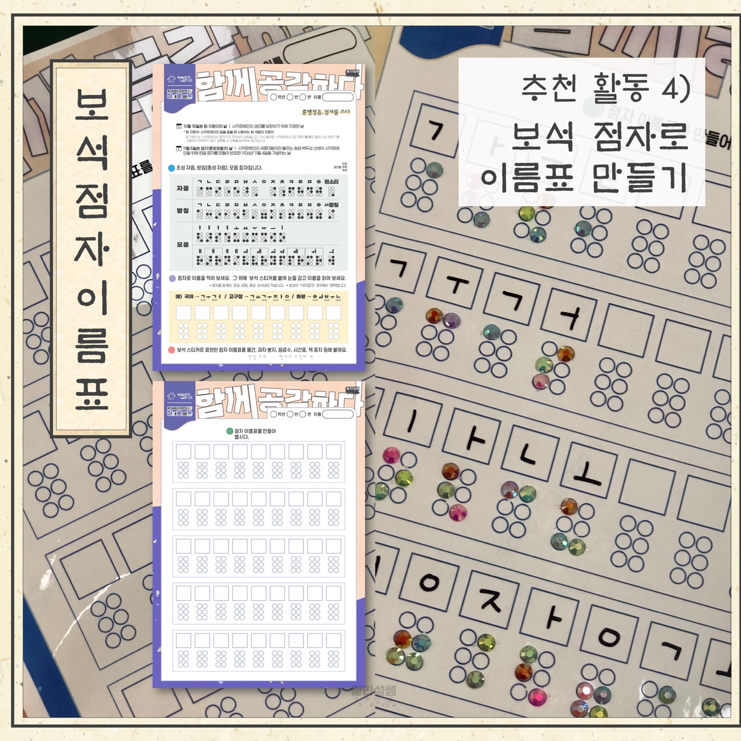 [4️⃣네 번째 활동] 보석 스티커로 점자를 표현해 봐요. 내 이름도 표현해 보고,