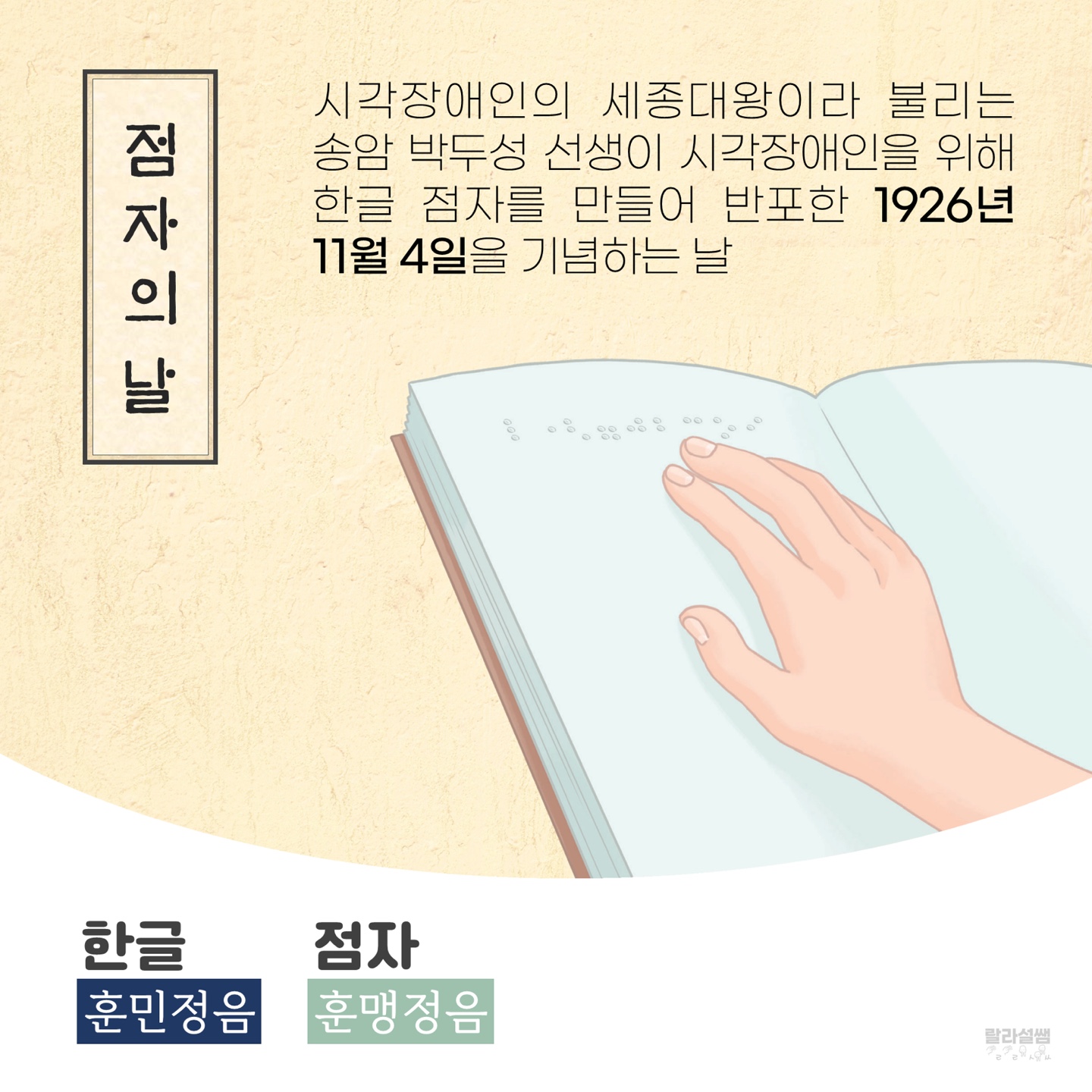 시각장애인을 위해 한글 점자를 만들어 반포한 1926년 11월 4일을 기념하는 날입니다.