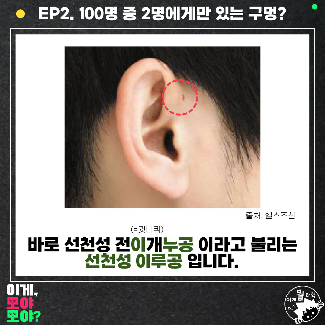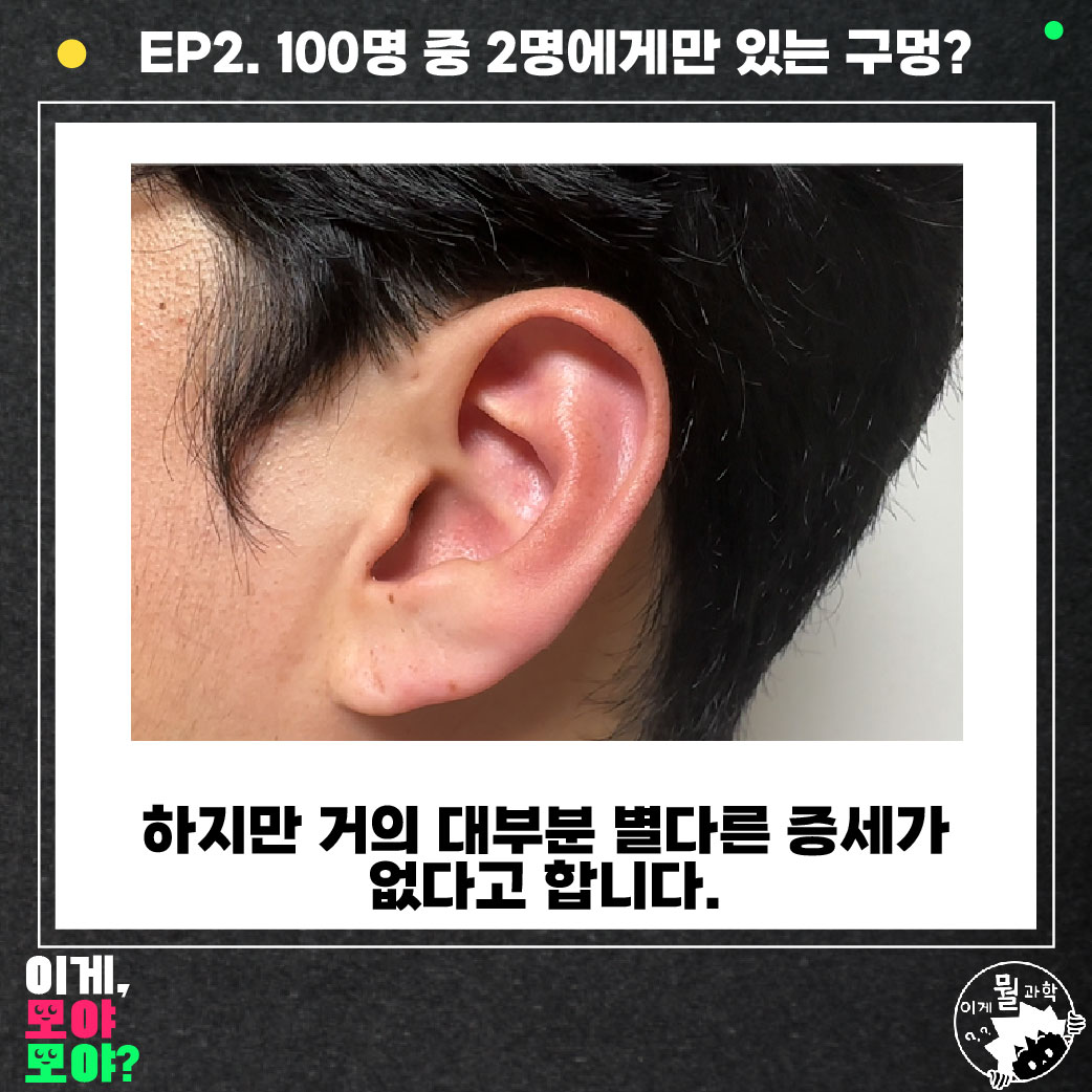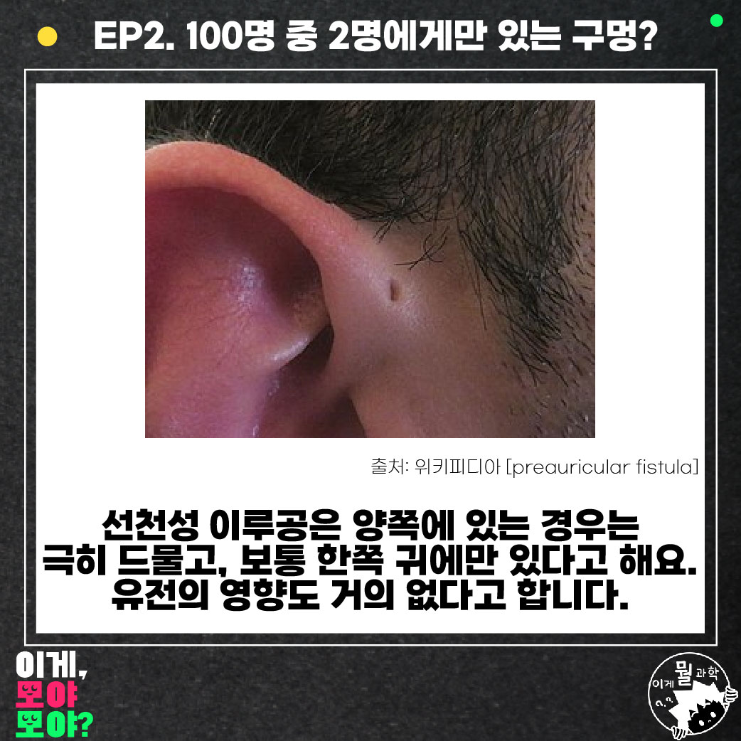 저는 어릴 적부터 귀에 구멍이 있는데요. 귀를 뚫지도 않았는데 구멍이 있다며 엄청 좋아했었죠. 그러다 문득 이게 무엇인지 다큰 성인이 되어서 조사를 해봤는데, 글쎄 100명 중 2~3명에게 있다는 '선천성 이루공'이라고 하더라고요.