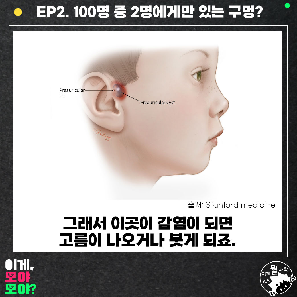 이곳에는 분비물이 나오는 가느다란 주머니가 있다고 해요. 그래서 감염이 되면 전체적으로 붓고 고름이 나온다고 합니다. 거의 대부분 별다른 증상은 없지만 다 큰 성인이 되어도 수술하는 사람들이 있다고 해요. 또 양쪽에 다 있는 경우는 거의 없고 한쪽 귀에만 있는 경우가 많다고 하죠.