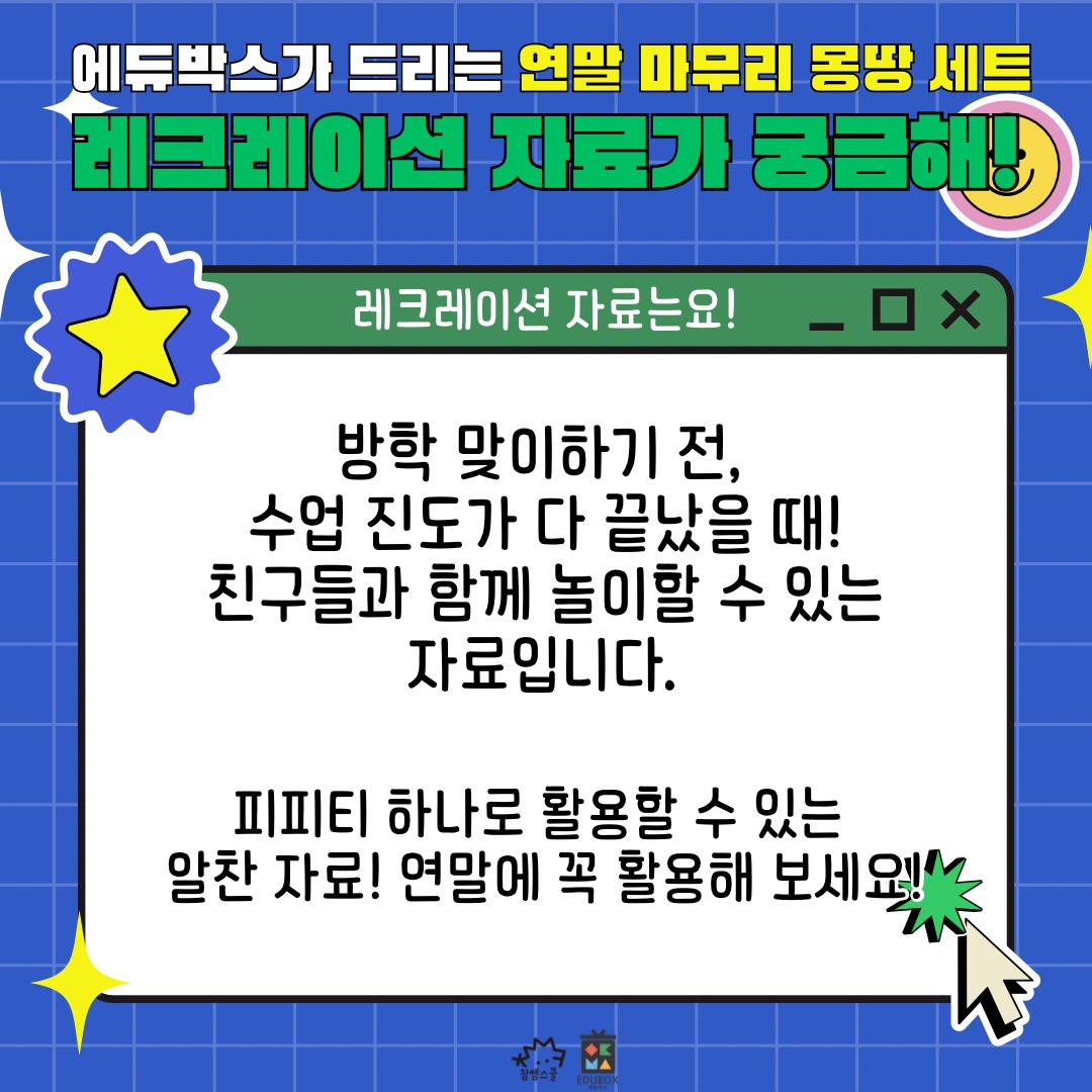 그중 레크레이션 자료는 방학 맞이 전, 진도가 다 끝났을 때, 애매한 수업 진도를 맞출 때 활용 가능한 자료들을 제작했답니다!