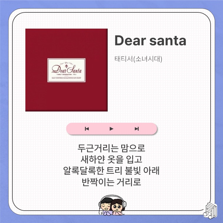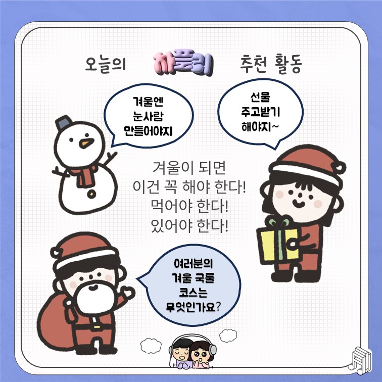 12월이 되면 묘하게 들뜨고 벅차는 분위기의 노래들이 곳곳에서 흘러나오는 것 같아요. 틀어놓기만 해도 마음이 몽글몽글 기분 좋아하는 매직🧚♀️ 차.플.리와 함께 우리 교실도 겨울 감성으로 채워보세요☃️