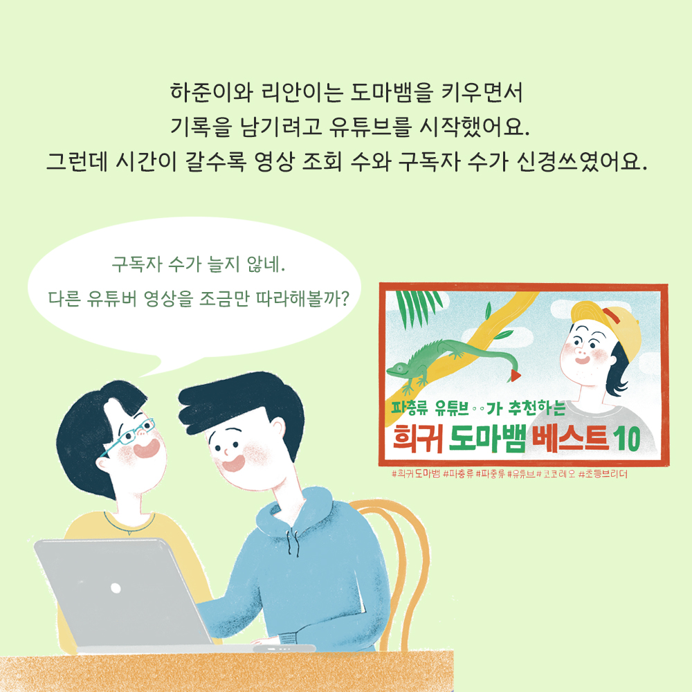 유튜버를 꿈꾸는 하준이와 리안이가 겪는 좌충우돌 에피소드를 통해 유튜브 '보는'법이 아닌 유튜브 '하는'법을 알 수 있어요.