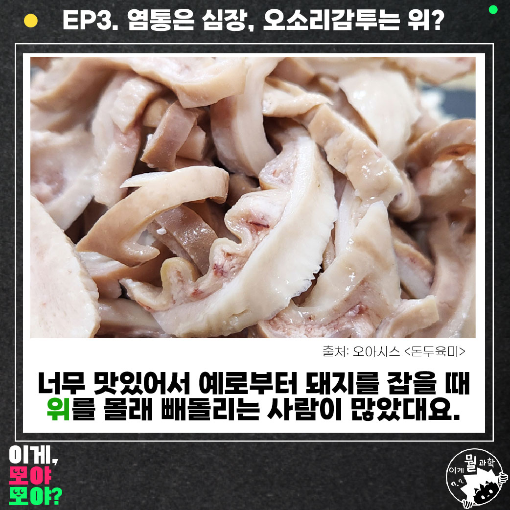 돼지 위를 말하는 오소리감투는 굉장히 맛있는 부위중 하나에요. 옛날에는 이 오소리감투를 먹기 위해 훔쳐 도망가는 사례도 많았다해요. 그래서 재빠른 오소리와 같이 감투를 놓고 싸운다고 해서 오소리감투라고 불렀대요.