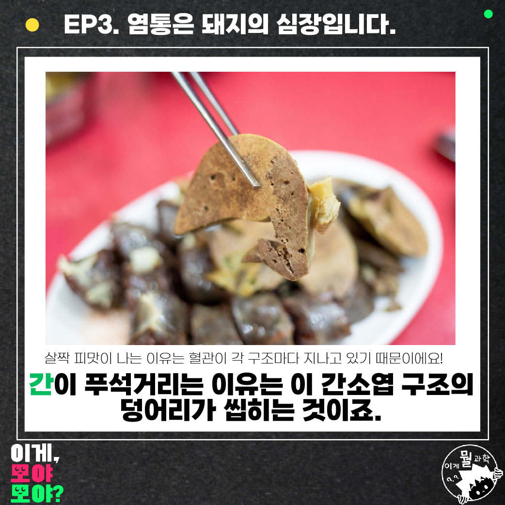마지막으로 우리가 먹는 간은 왜 푸석한 식감일까요? 이는 간세포와 연관이 있는데요, 간세포가 모인 간소엽이라는 구조는 육각형 모양입니다. 그리고 이 꼭짓점으로 혈관이 흐르고 있죠. 그래서 간은 식감이 부스러지는데 이는 우리가 간소엽을 씹는겁니다. 간이 약간 피맛이 나는 것도 혈관이 이렇게 지나가기 때문이겠죠?