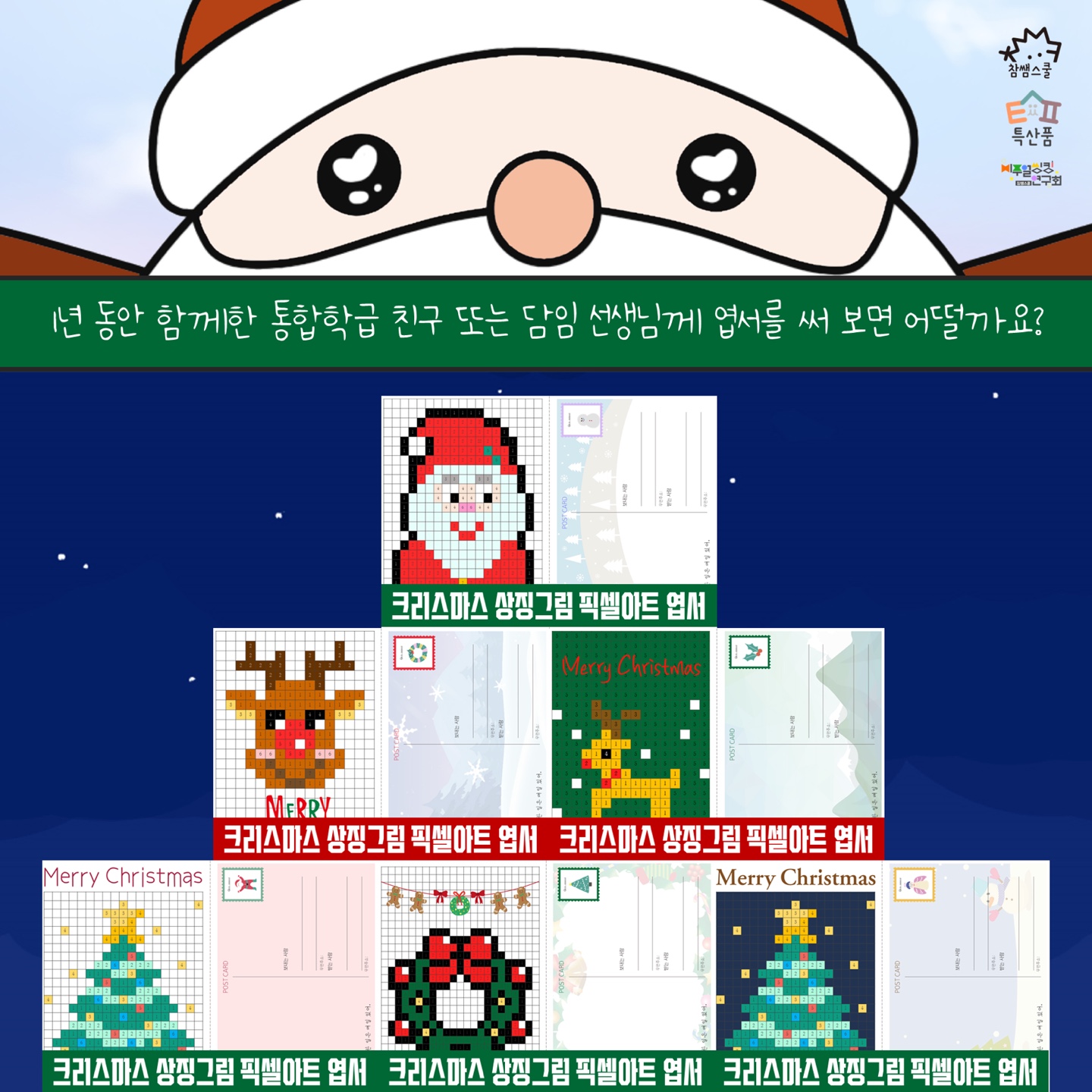 크리스마스 하면 ‘산타, 루돌프, 크리스마스트리, 크리스마스 리스 등’ 다양한 상징이 떠오릅니다. 크리스마스 상징을 픽셀아트로 만들었어요. 숫자만 따라가면 나만의 크리스마스 그림이 완성돼요. 뒷면에는 간단한 편지를 쓸 수 있습니다.