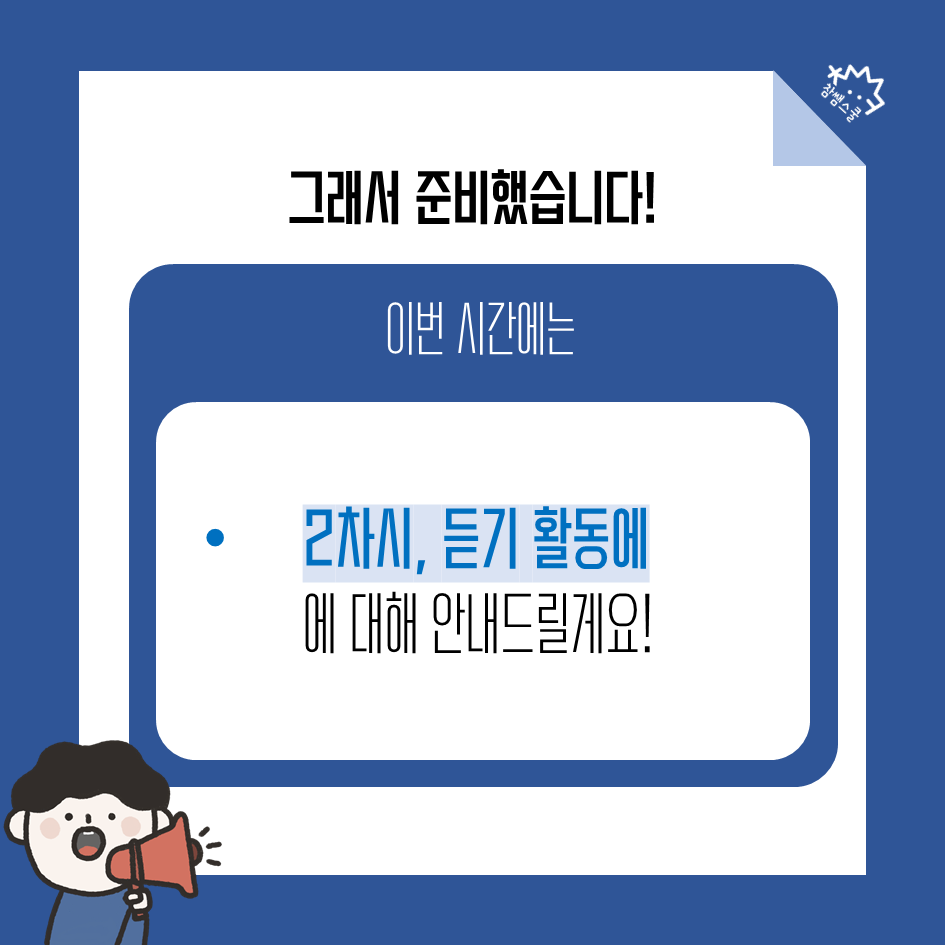 이번 시간은 2)듣기(listening) 활동 편을 준비해보았습니다.