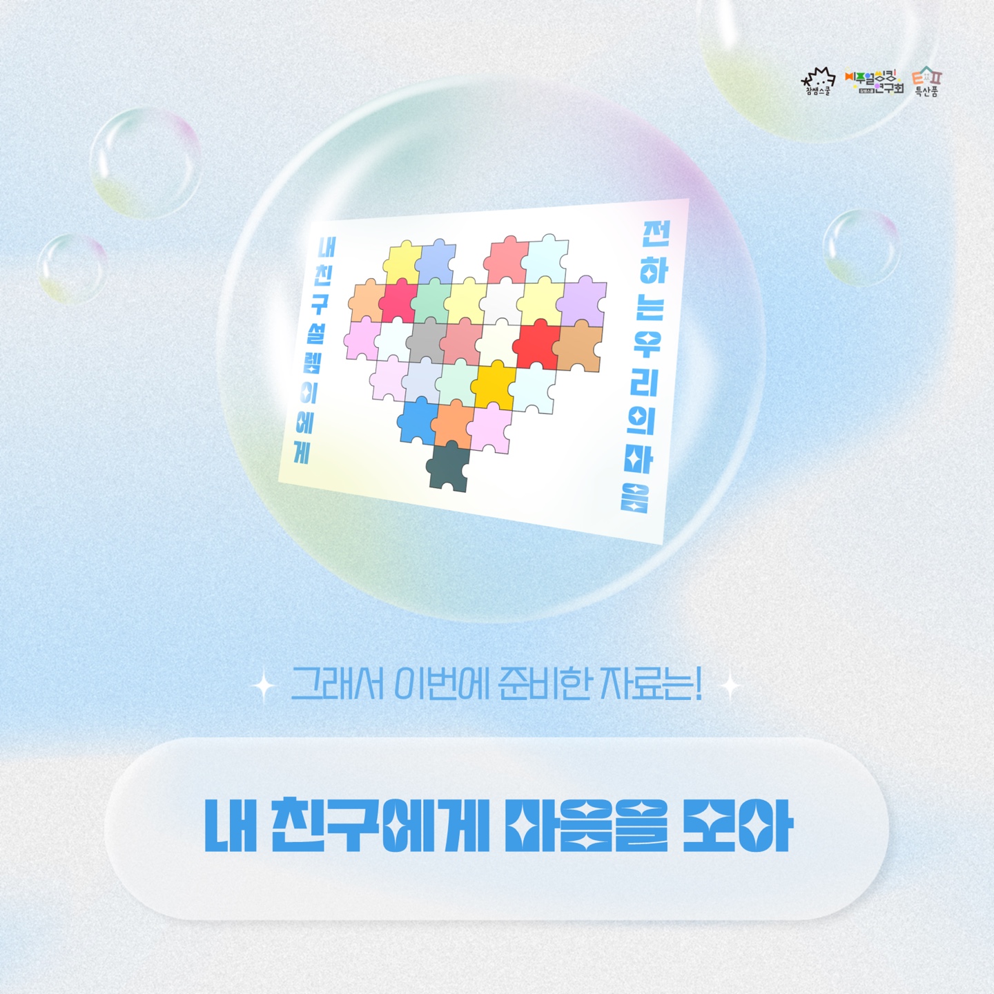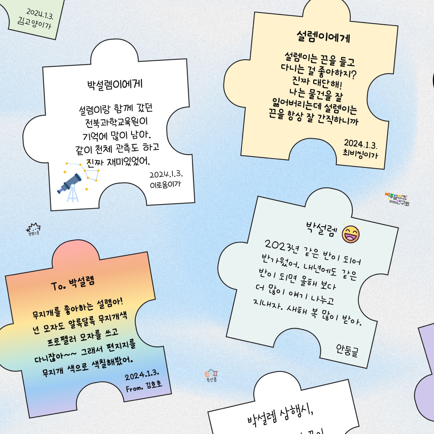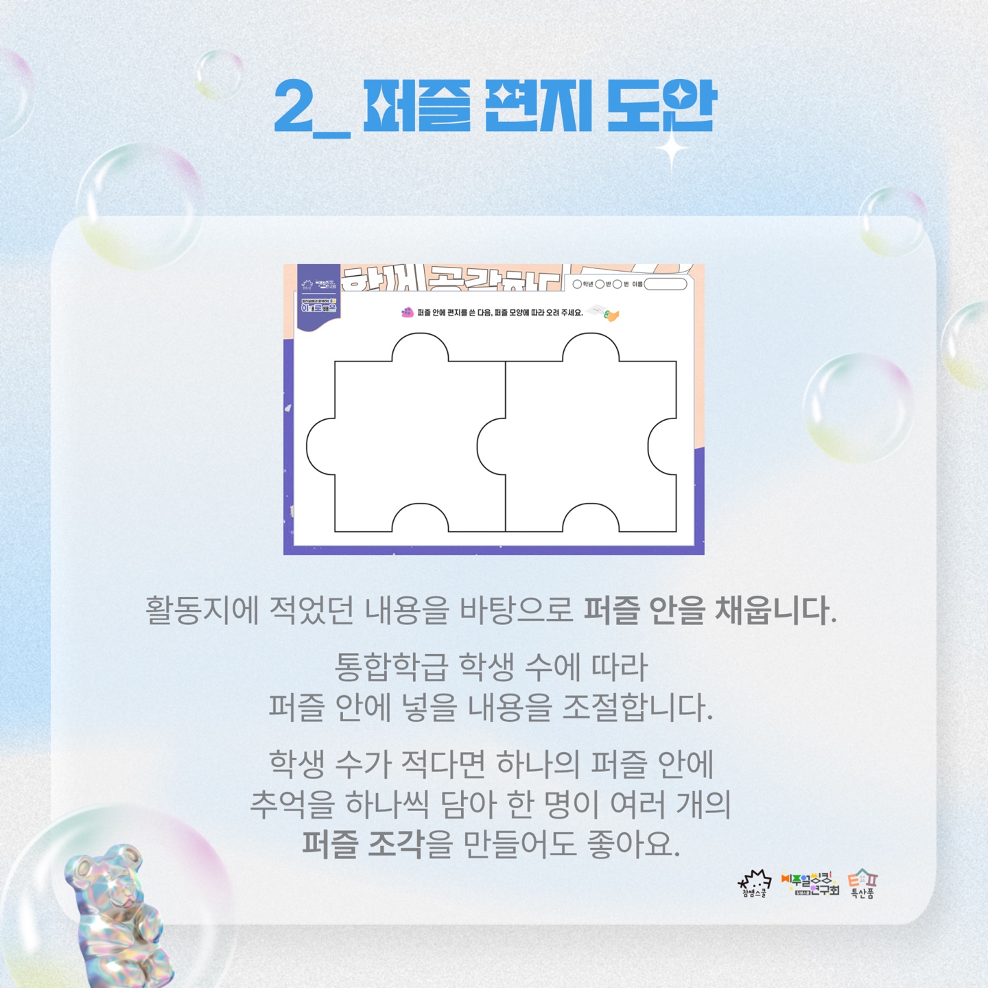 퍼즐 안에는 별별이를 위한 편지를 적습니다. 편지를 적기 어려울 때는 활동지에 적었던 내용을 바탕으로 퍼즐 안을 채웁니다. ‘별별이가 무엇을 가장 좋아하지?’, ‘별별이랑 추억이 뭐가 있더라?’, ‘별별이가 잘하는 행동은?’ 통합학급 학생 수에 따라 퍼즐 안에 넣을 내용을 조절합니다. 학생 수가 적다면 하나의 퍼즐 안에 추억을 하나씩 담아 한 명이 여러 개의 퍼즐 조작을 만들어도 좋습니다.
