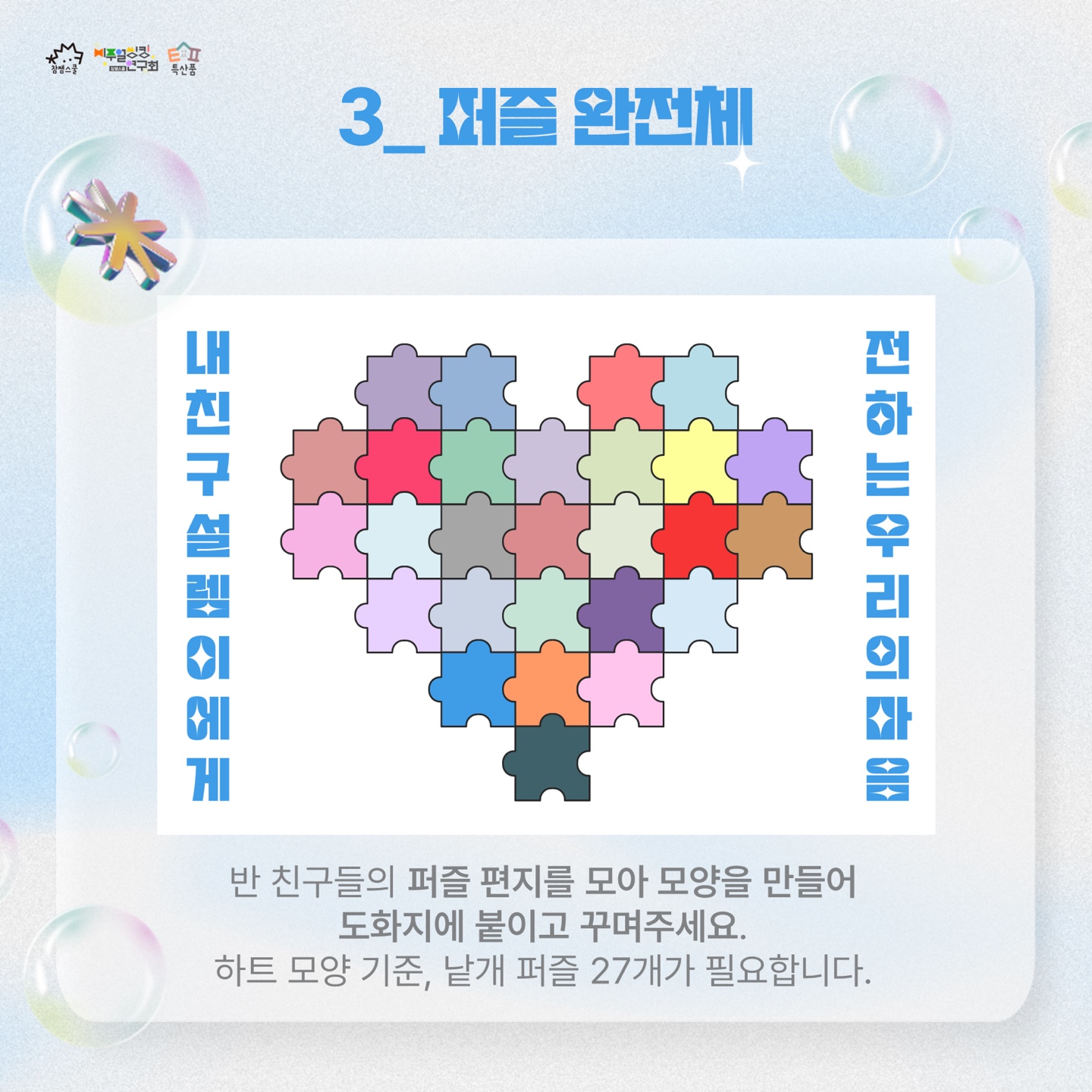 반 친구들의 퍼즐 편지를 모아 모양을 만들어 도화지 붙이고 꾸며주세요. 하트 모양 기준, 낱개 퍼즐 27개가 필요합니다.