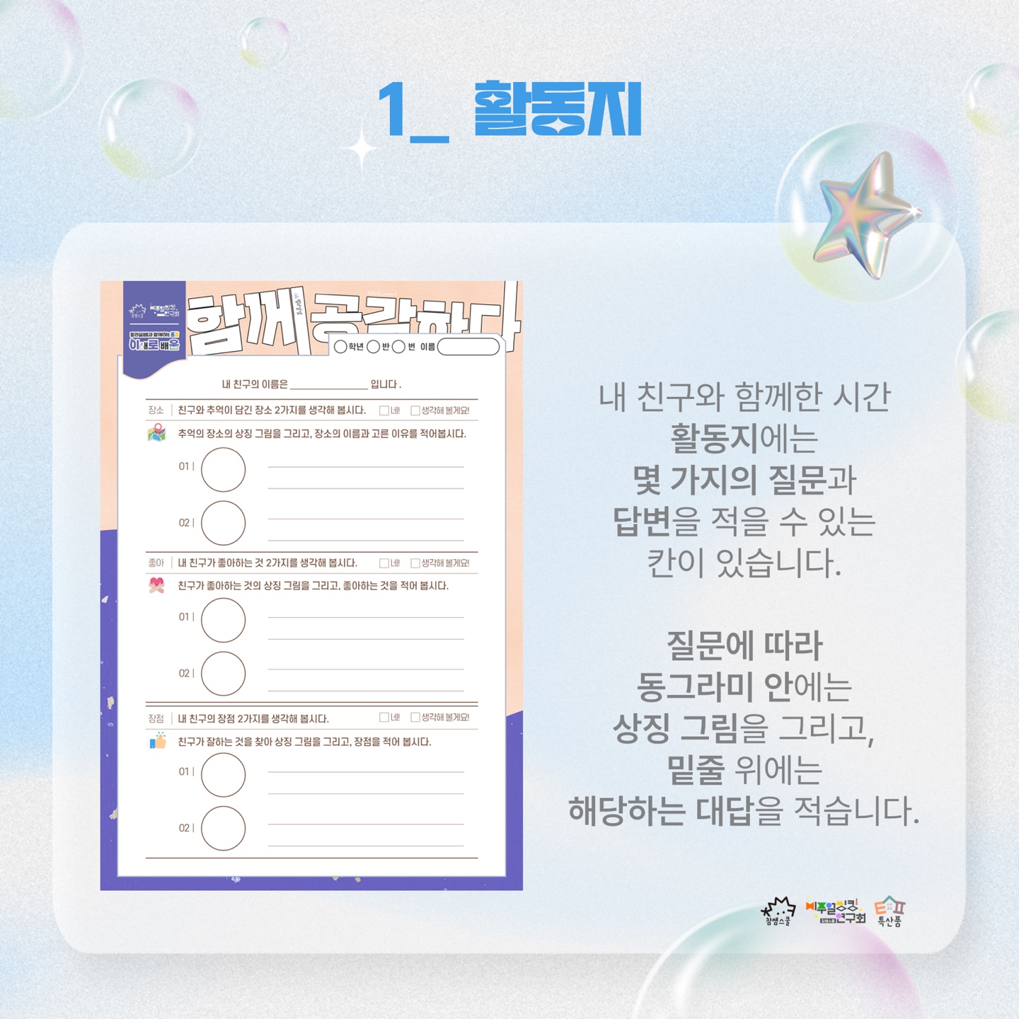 활동지에는 몇 가지의 질문과 답변을 적을 수 있는 칸이 있어요. 질문에 따라 동그라미 안에는 상징 그림을 그리고, 밑줄에는 해당하는 대답을 적습니다.