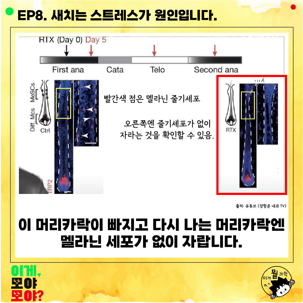 이 스트레스로 머리카락을 검게 만드는 멜라닌 줄기 세포들이 전부 멜라닌 세포로 바뀌고,
