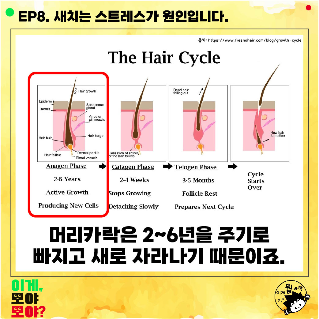 그 이유는 머리카락은 2~6년을 주기로 빠지고 자라나기 때문이죠.