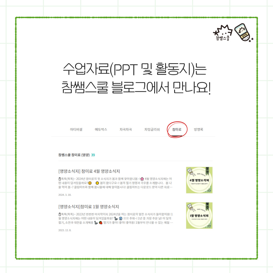 | [영양소식지] 참미료 4월 영양소식지 (14) | 2024.03.18 |
