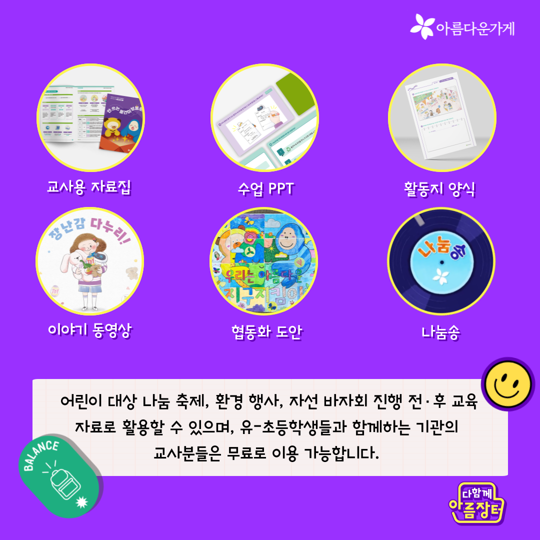 어린이 나눔 축제, 환경 행사, 바자회 전/후 교육 자료로 활용할 수 있으며, 오프라인 행사를 준비하는 선생님들께서는 무료로 이용이 가능합니다.<다함께 아름장터>와 함께 환경을 생각하고 나눔을 실천하는 시간을 가져 보아요!😊
