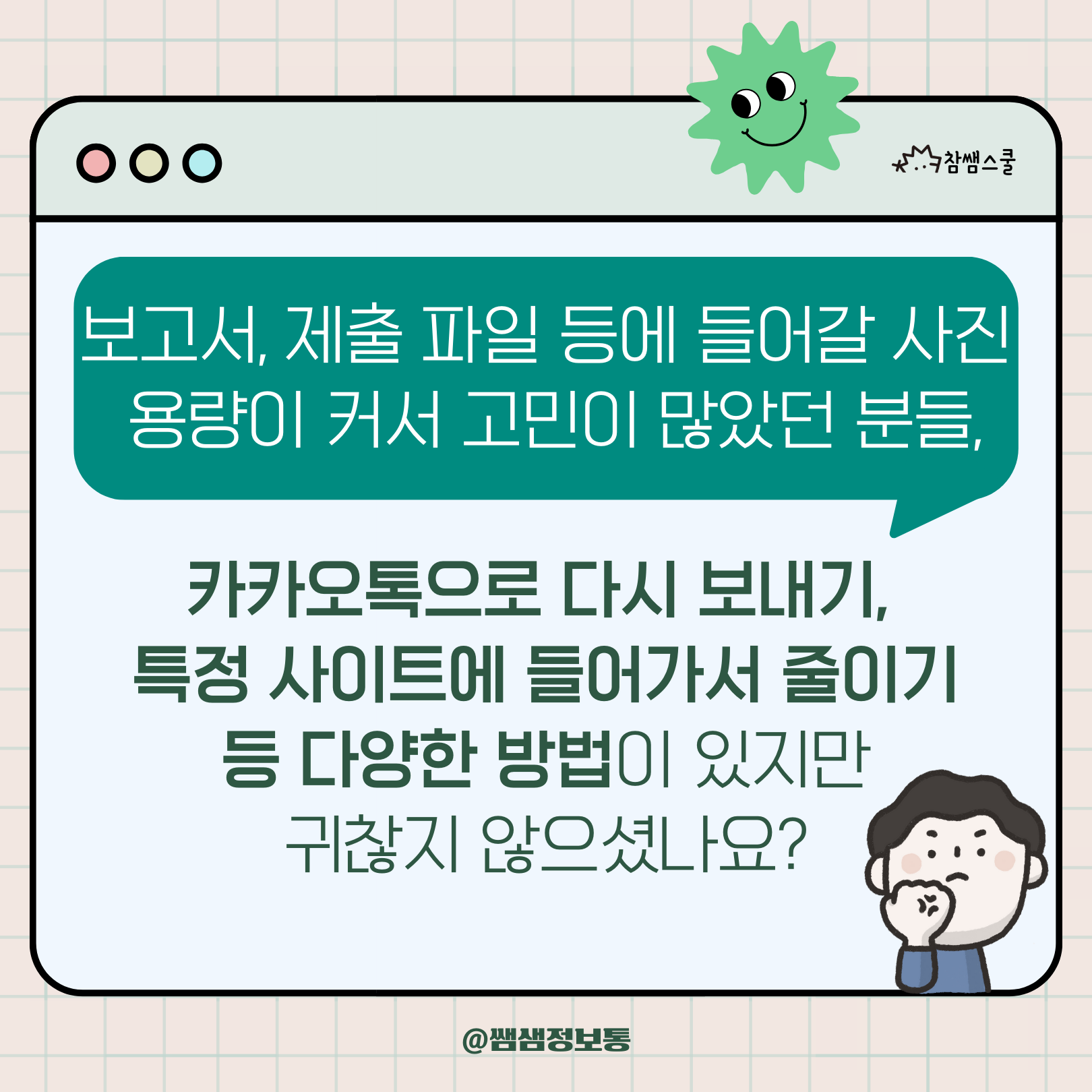 카카오톡으로 일반화질 설정한 후에 보내고, 특정 사이트에 들어가서 바이러스 걱정할 필요없이, 클릭 세 번만에 용량을 손쉽게 줄이는 방법을 쌤정에서 안내드립니다!