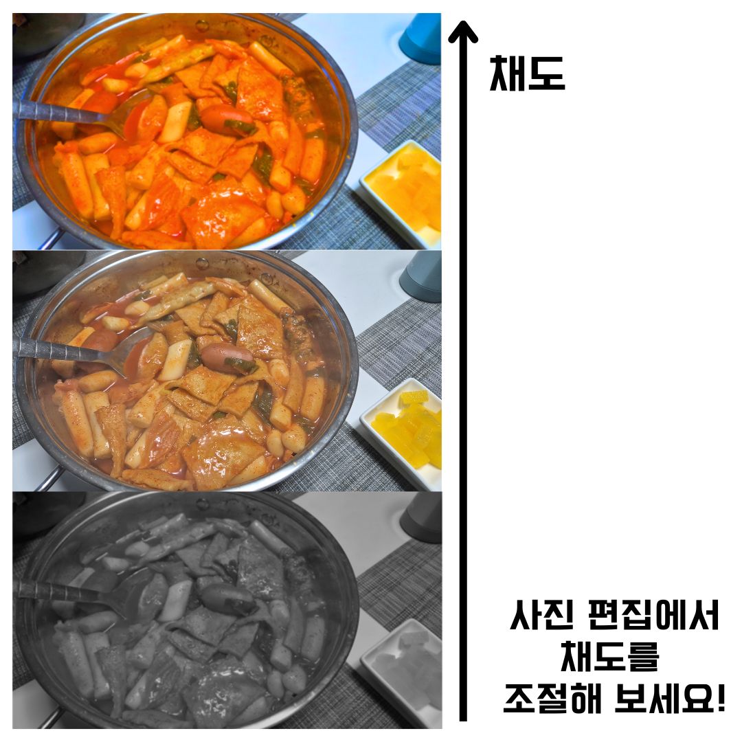 사진 편집 기능으로 명도와 채도를 조절해보며 어떤 변화가 생기는지 관찰하고,