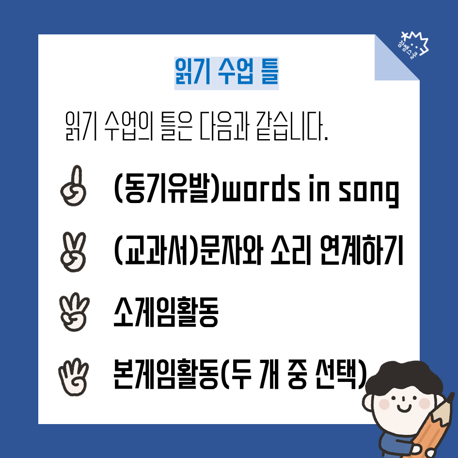 읽기 차시에서는 딱 세 가지 활동만 기억하면 만능으로 사용할 수 있답니다!