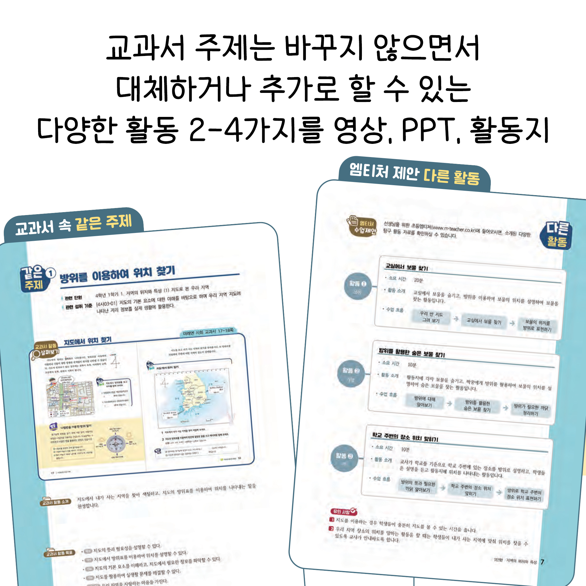 같은 주제별로 대체하거나 추가할 수 있는 다양한 활동을 담아 교과서 출판사에 관계없이도 활용할 수 있습니다.