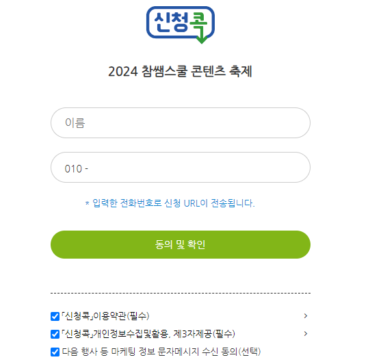 신청 링크에 성함과 번호를 입력하시면 문자가 발송됩니다.