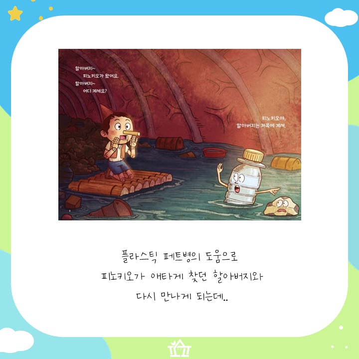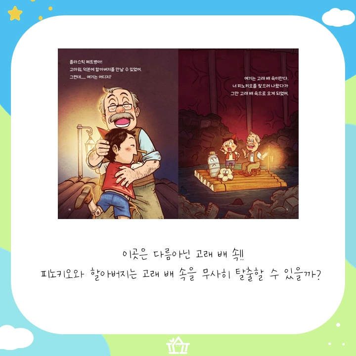 파도에 휩쓸려 고래 배 속에서 할아버지와 다시 만나게 된 피노키오. 그런데 어째서 고래 배 속에 플라스틱 페트병과