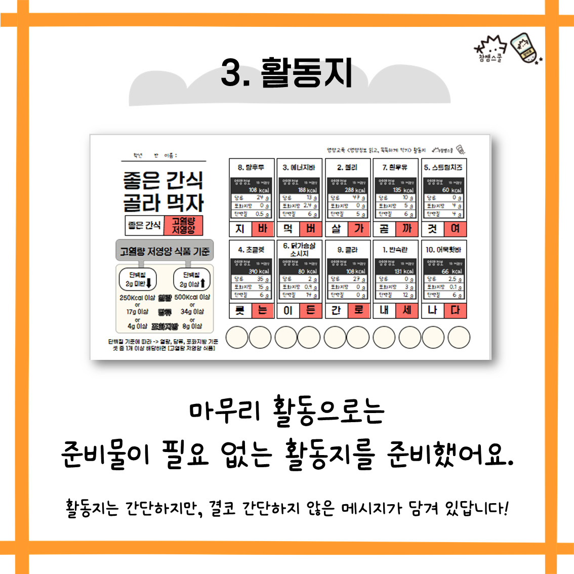 내가 좋아하는 간식이 고열량 저영양 식품인지 스스로 확인할 수 있답니다!