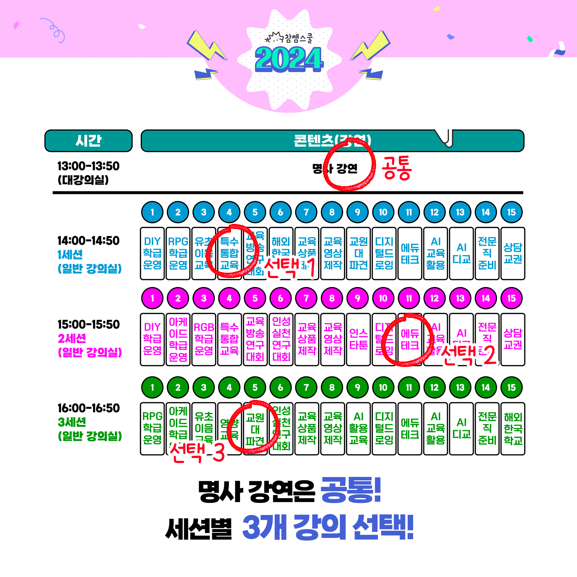 📢 세션별 1강의씩 총 3개의 강의를 신청 가능합니다