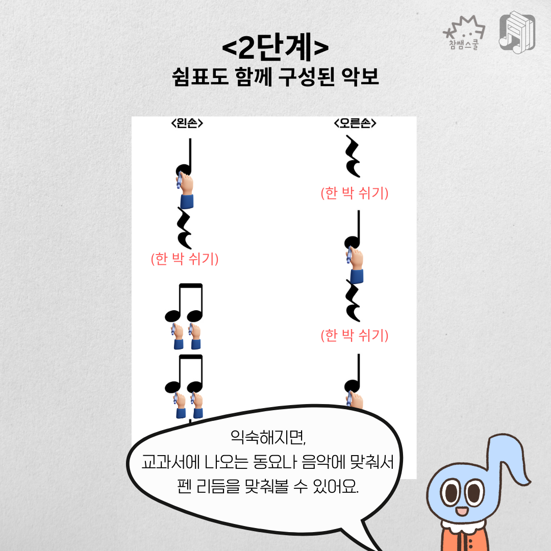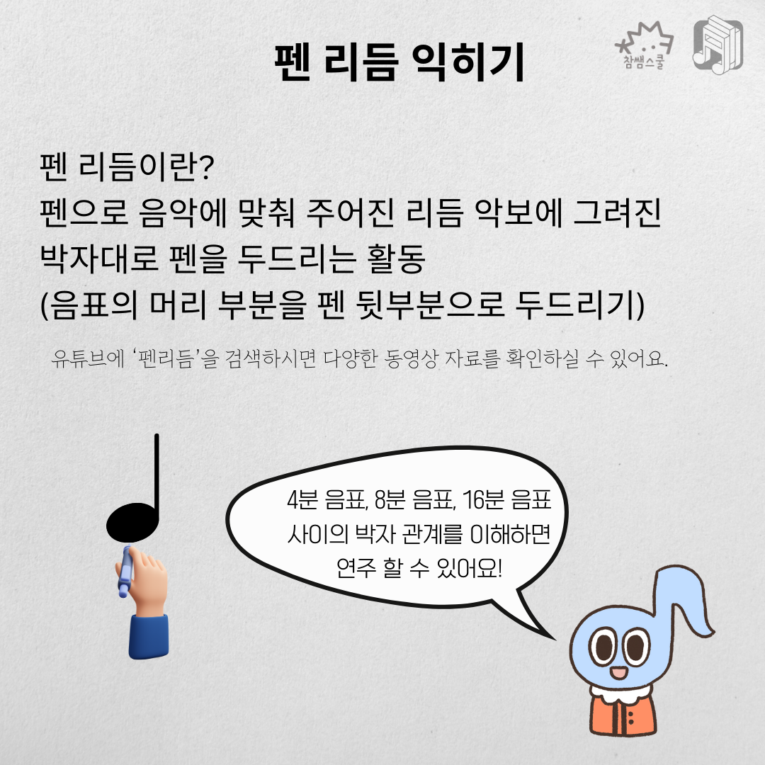 펜을 활용하여 음표간 박자관계와 리듬감을 익히는 준비했습니다! 신나게 펜을 두드리면서 박자 감각을 길러봐요!
