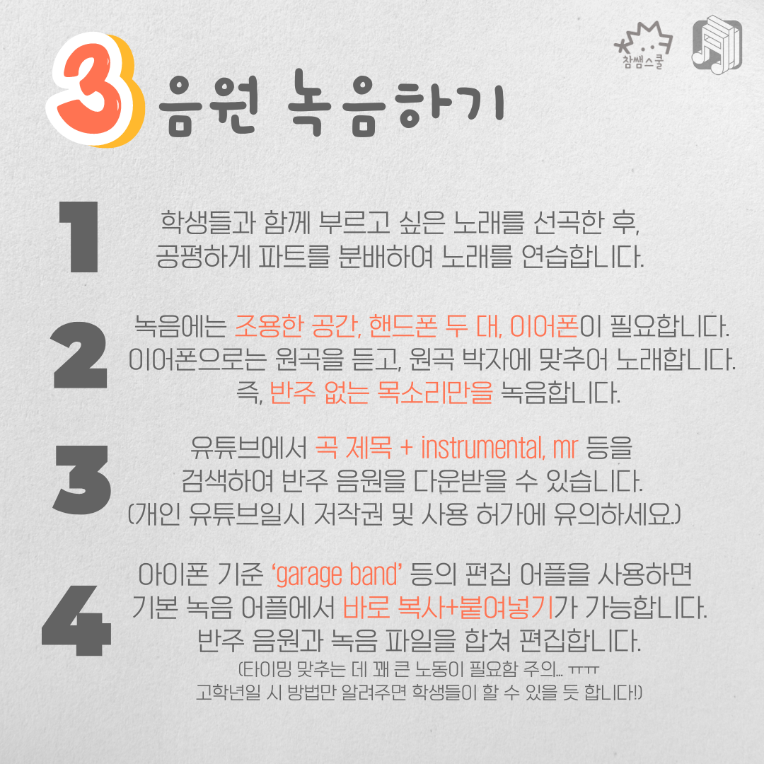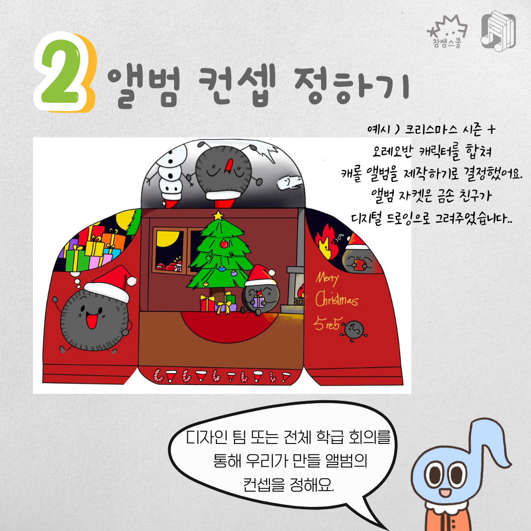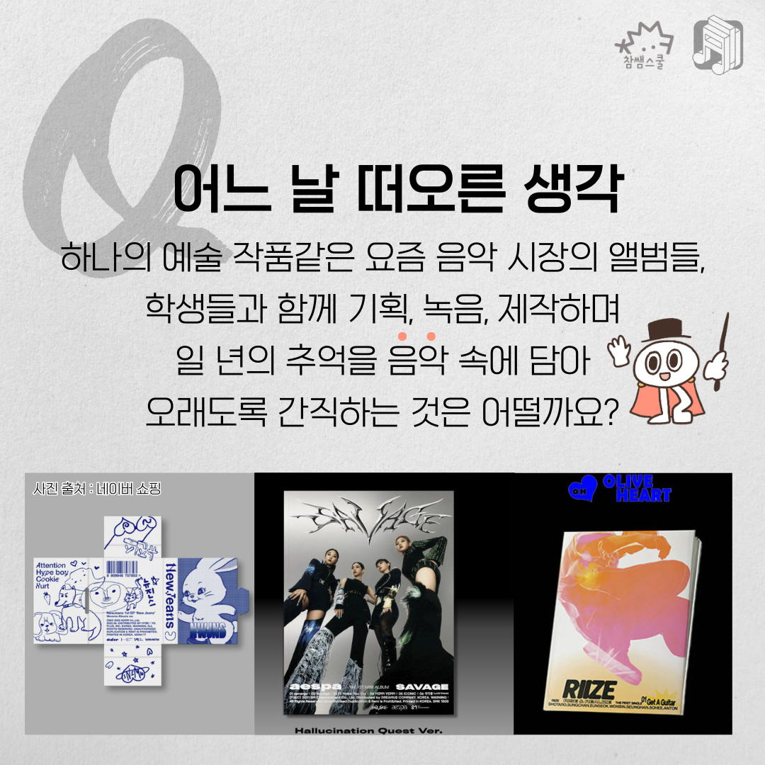 우리 만의 아이디어와 목소리를 담아 학급 ‘앨범’ 을 제작해보는건 어떨까요? 음악이라는 매개체로 추억들을 오래도록 소중히 간직할 수 있을 거예요🎵