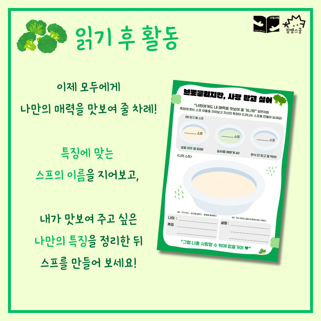 🥦 아이들에게 사랑받고 싶어하는 브로콜리는 결국 브로콜리만의 특징을 가득 담은 브로콜리 스프의 모습으로 아이들을 만나 행복해져요, 우리는 어떤 스프가 될 수 있을까요?