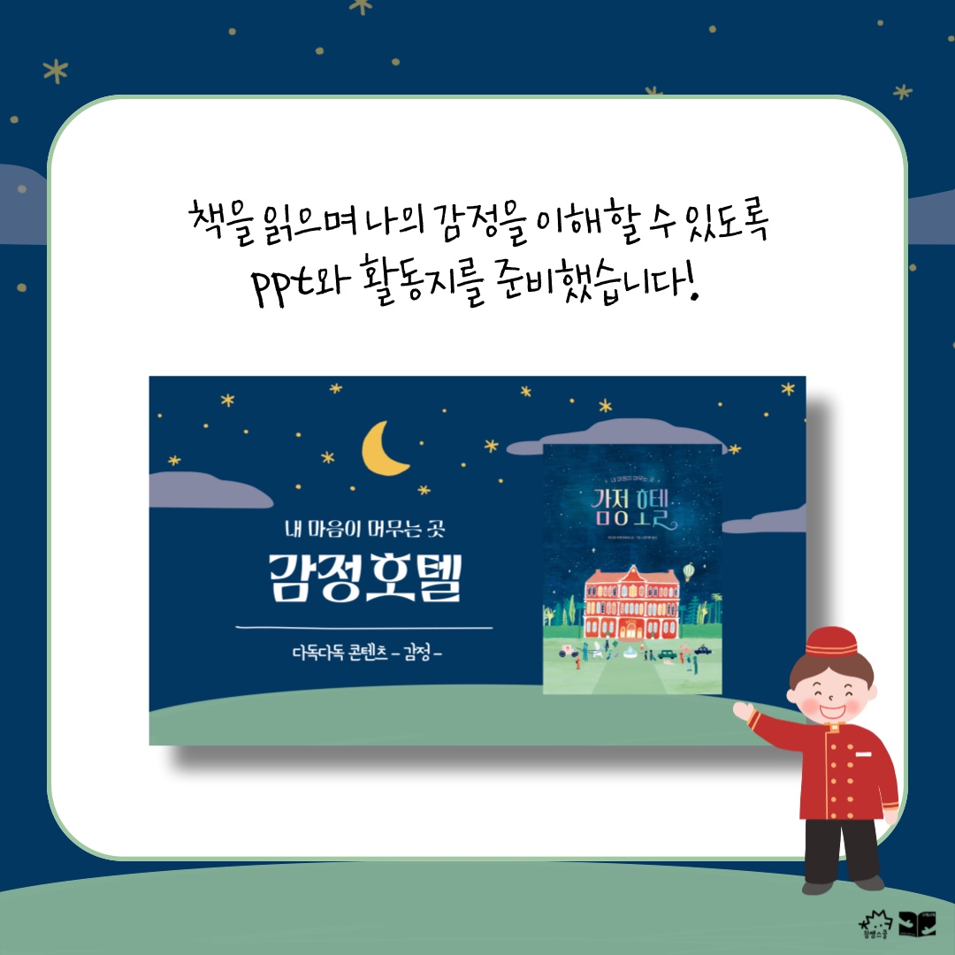 그림책 <감정호텔> 속 감정호텔은 내 감정들이 머물다 가는 곳입니다. 그리고 그 감정들의 특징을 잘 파악하고 다룰 줄 아는 지배인이 있지요.