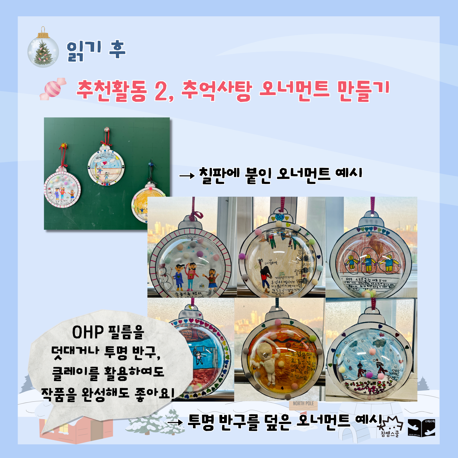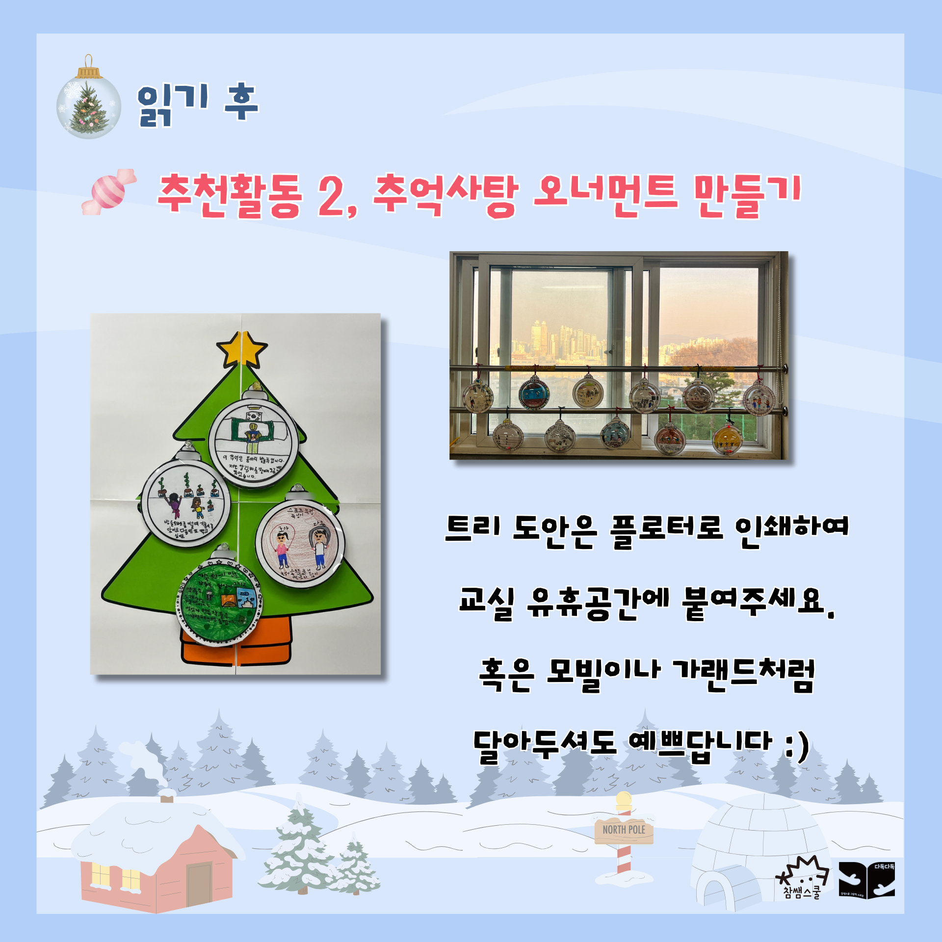 마지막으로 우리의 소중한 추억 오너먼트는 트리에 걸어 알록달록 예쁘게 꾸며줍시다 💚