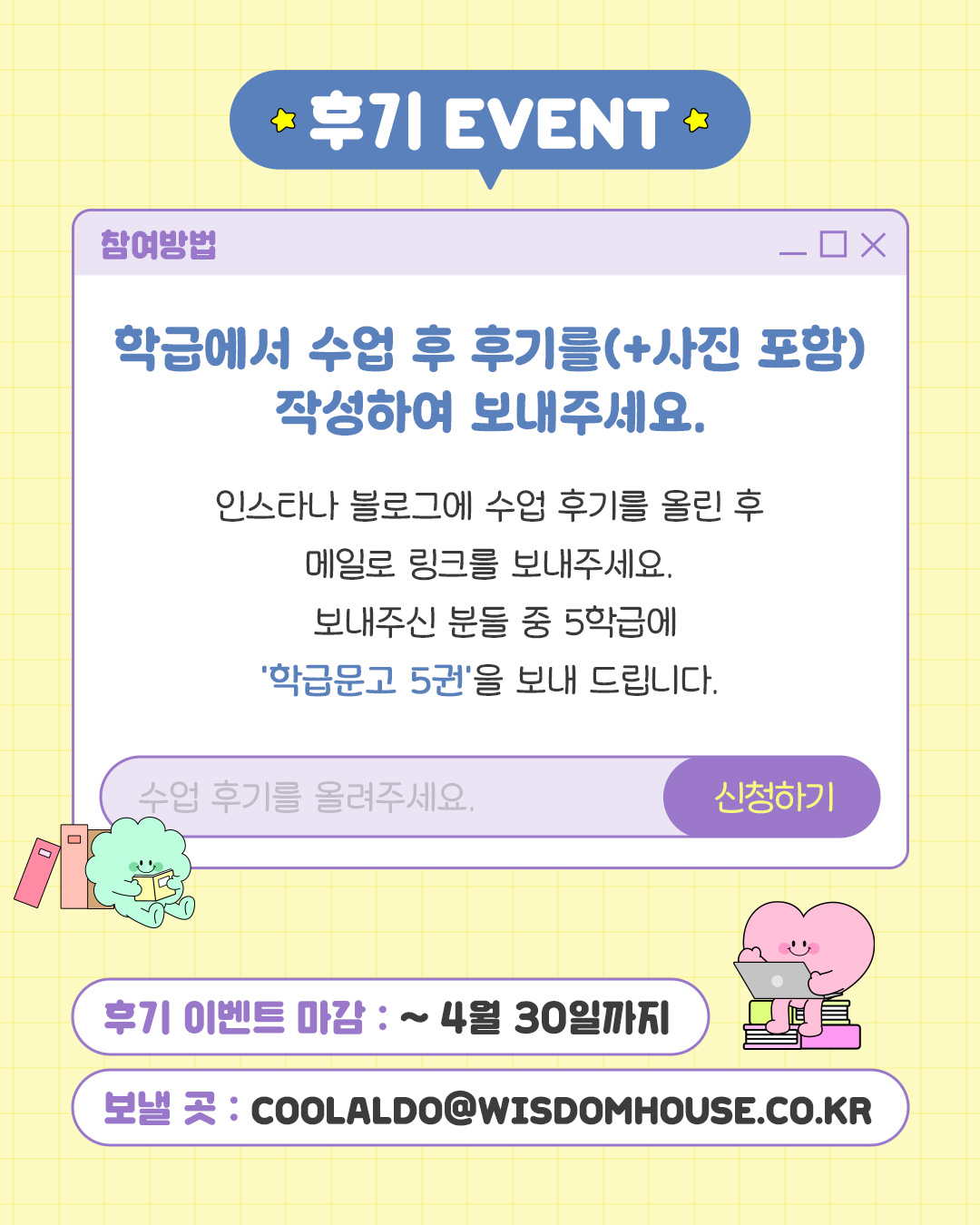 5학급을 선정하여 '학급문고' 5권을 보내드립니다. (후기 이벤트 마감 : ~ 4월 30일까지)