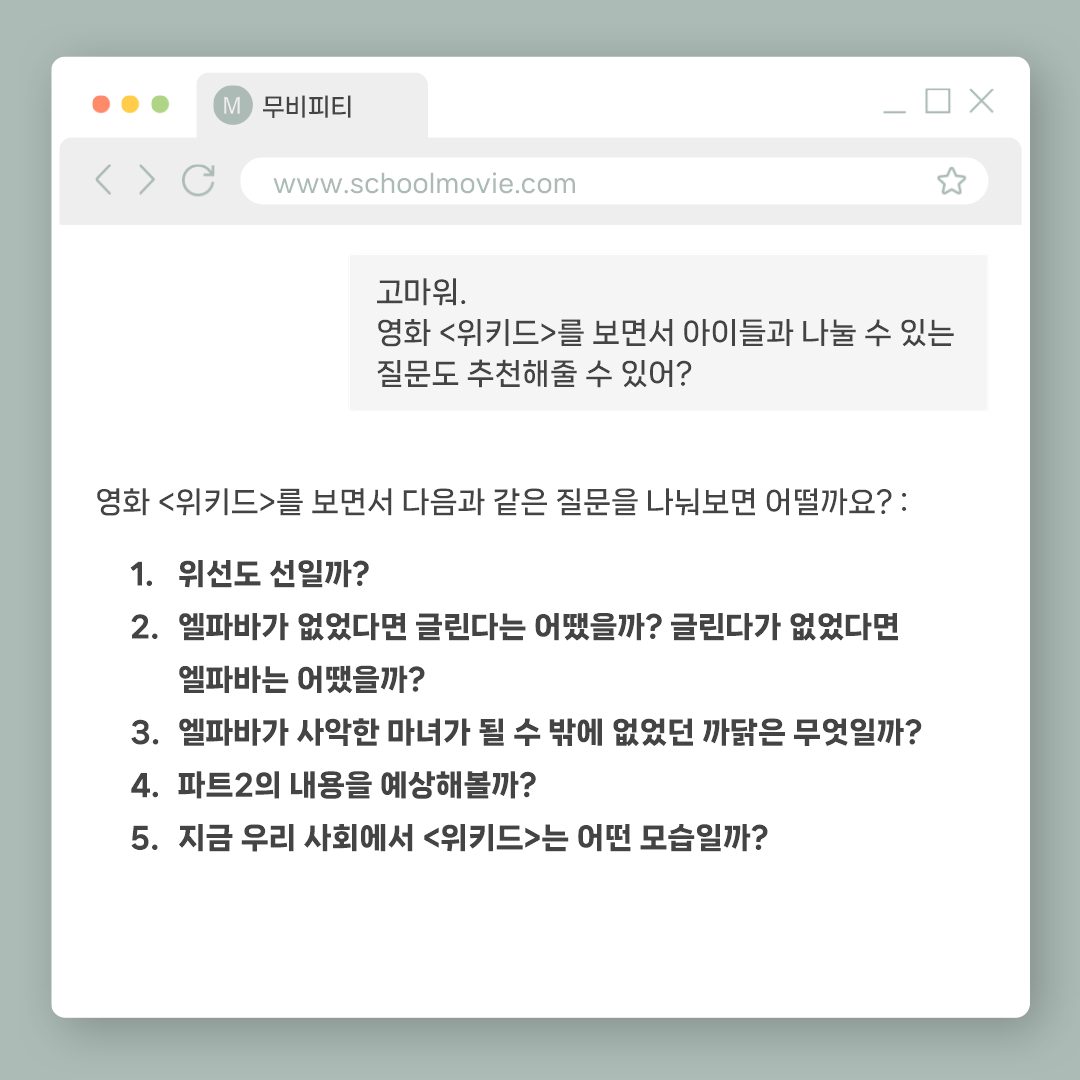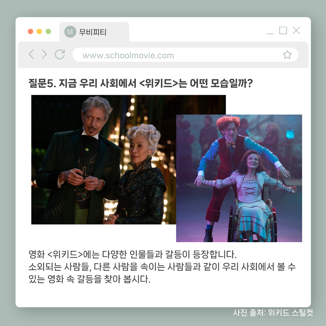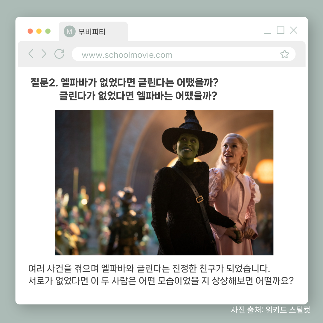 영상미와 좋은 음악 뿐만 아니라 생각할 거리가 많은 영화 <위키드>를 보고 아이들과 함께 나눌 수 있는 질문들과 활동지를 준비했습니다.