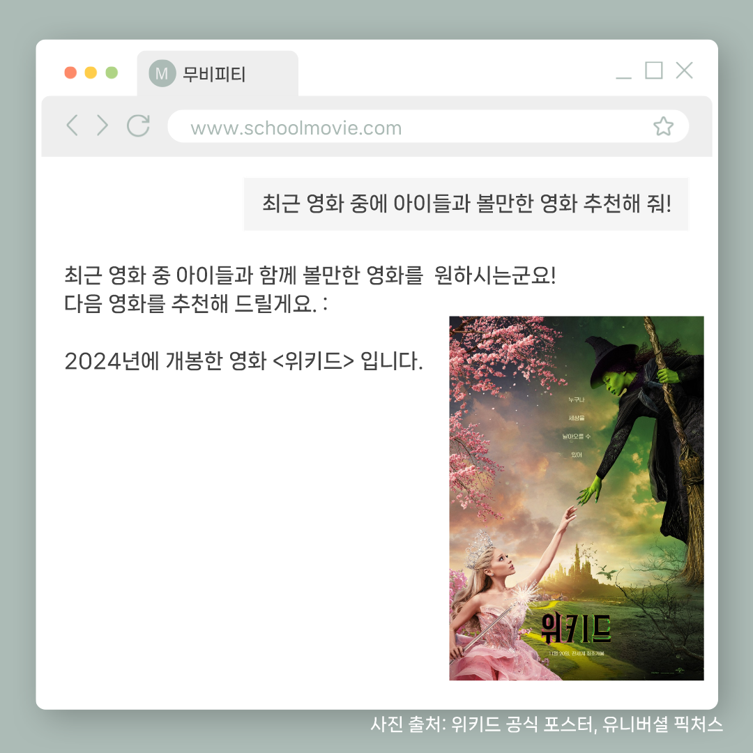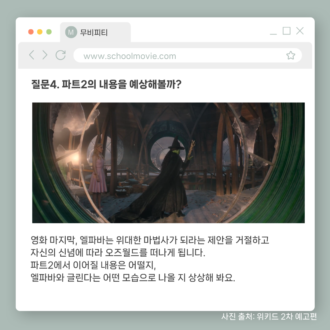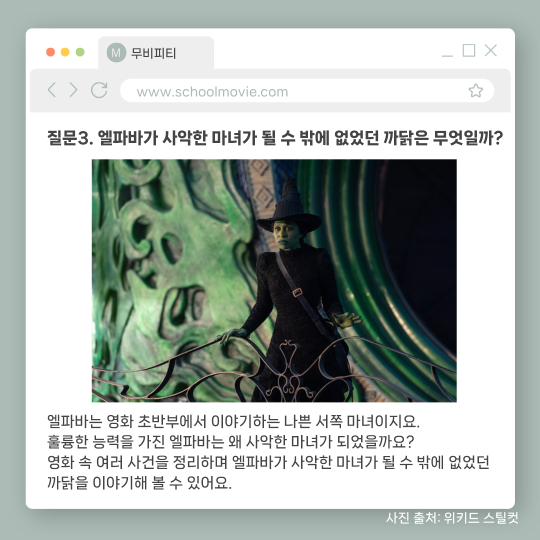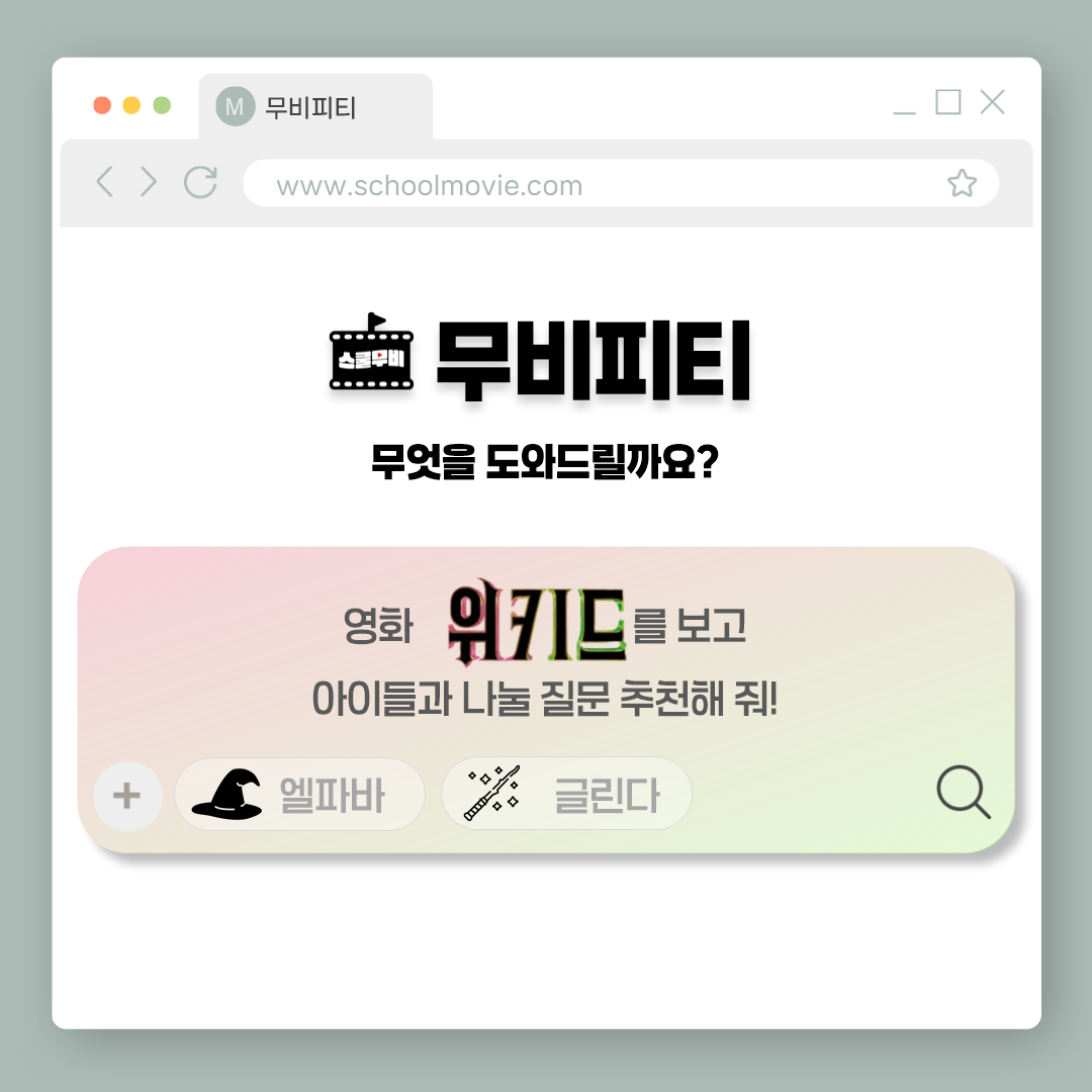 영상미와 좋은 음악 뿐만 아니라 생각할 거리가 많은 영화 <위키드>를 보고 아이들과 함께 나눌 수 있는 질문들과 활동지를 준비했습니다.