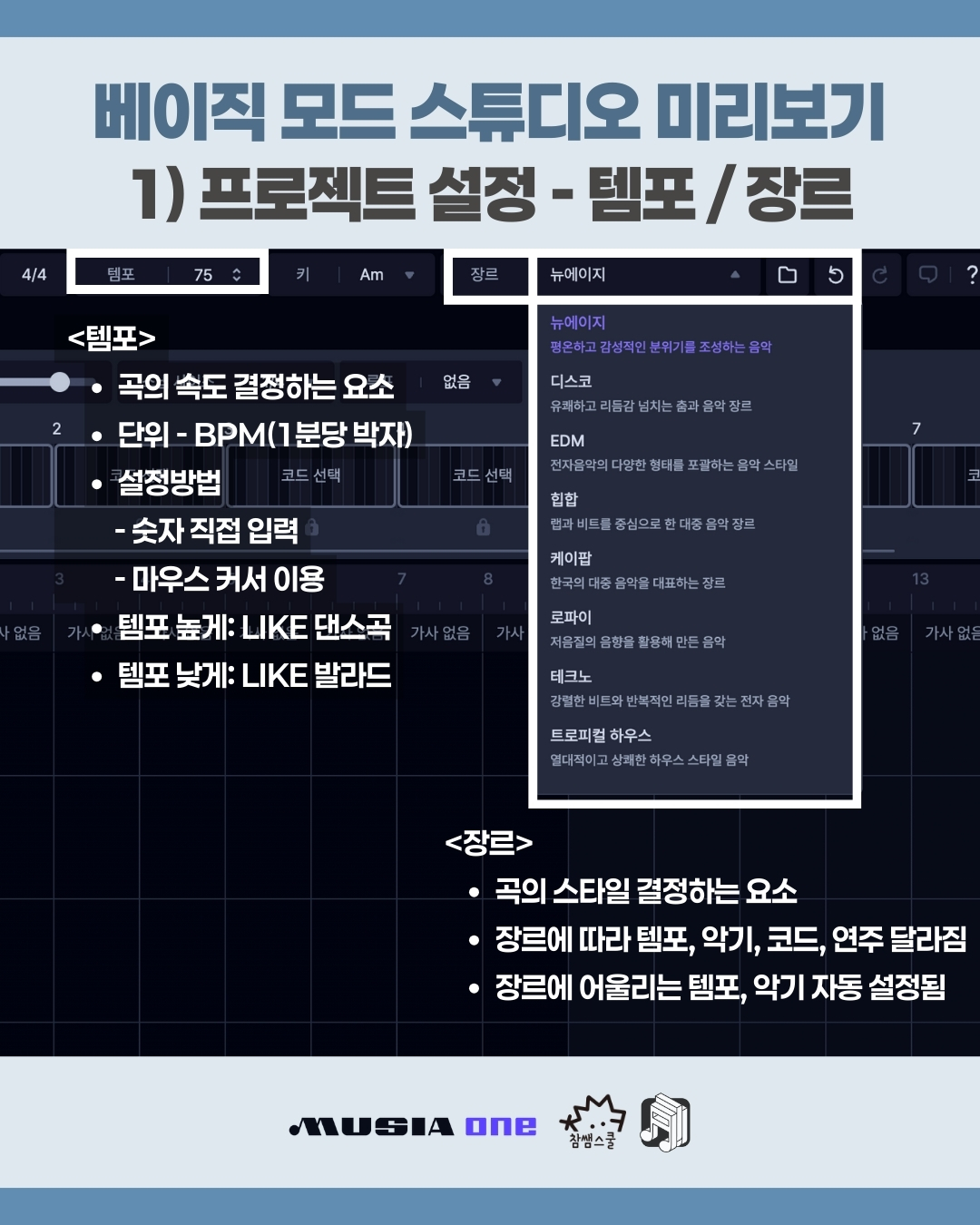 ✔ 원하는 장르, 템포, 키, 박자를 설정하고