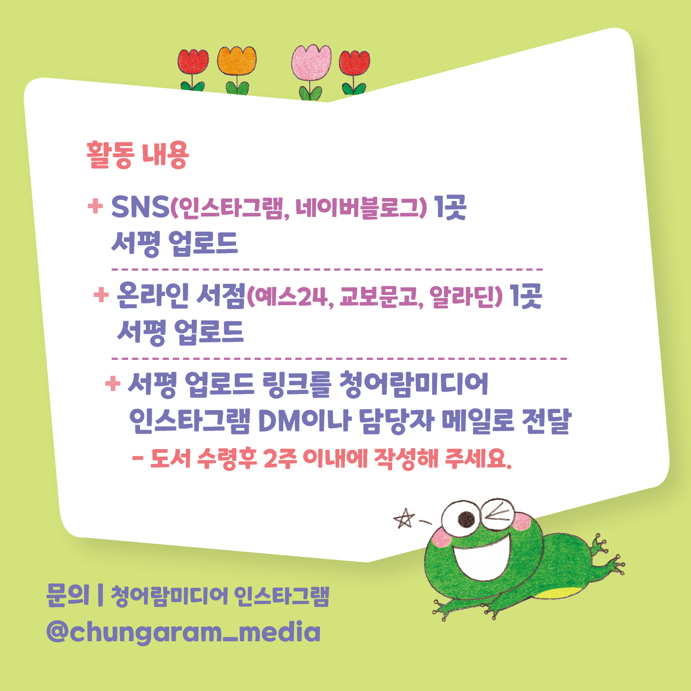 서평 업로드 링크를 청어람미디어 인스타그램 DM이나 담당자 메일로 전달해 주세요.