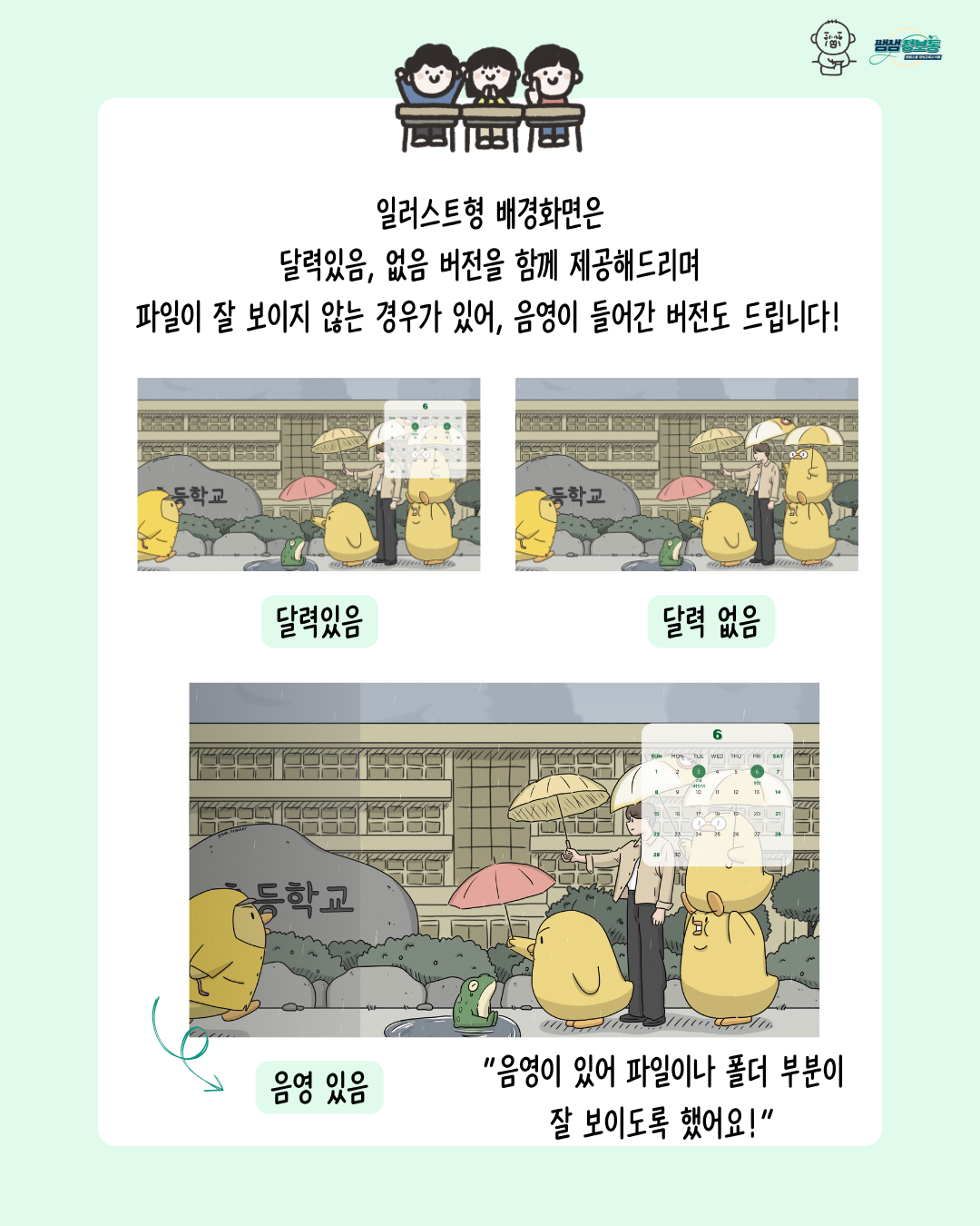 이번 달 배경화면은 🌧️ 꿉꿉한 장마에도 함께하는 우정을 담았습니다.