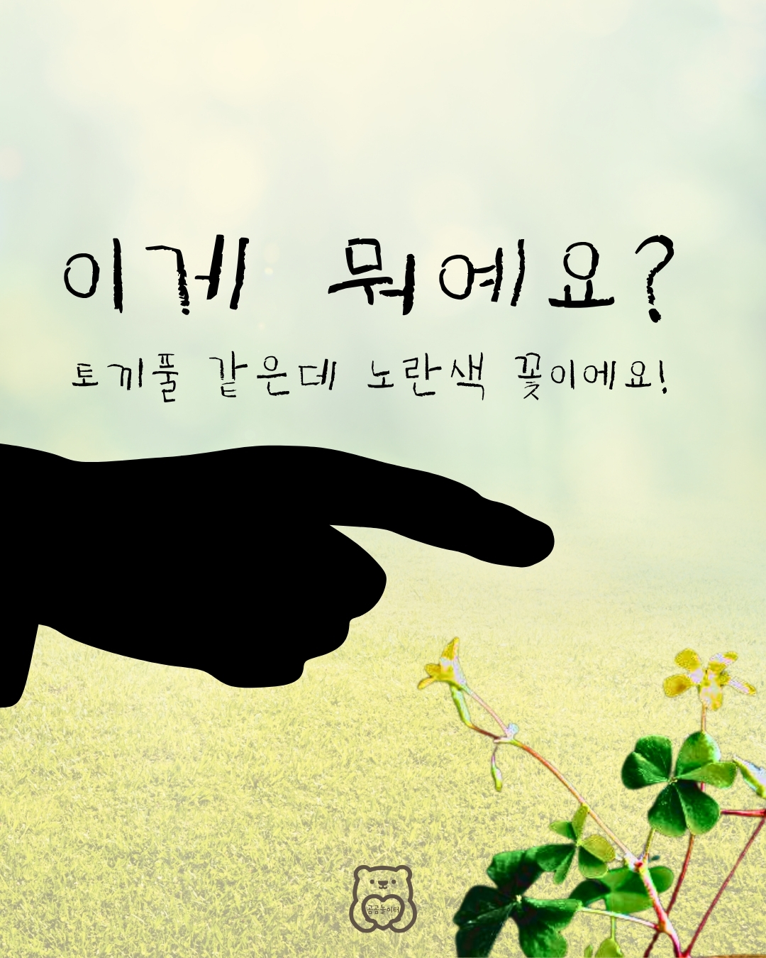 “이게 뭐예요? 토끼풀 같아요! 그런데… 노란 꽃이 피었어요!”