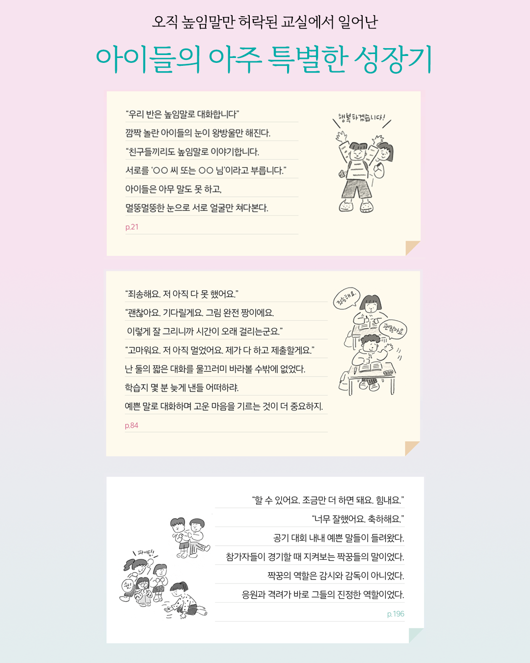 "오직 높임말만 허락된 교실에서 일어난 아주 특별한 성장 기록" 아이들이 서로를 ‘○○ 씨’, ‘○○ 님’이라 부르고, “지우개 빌려줄까요?”, “천천히 하세요”, “정말 멋져요”처럼 다