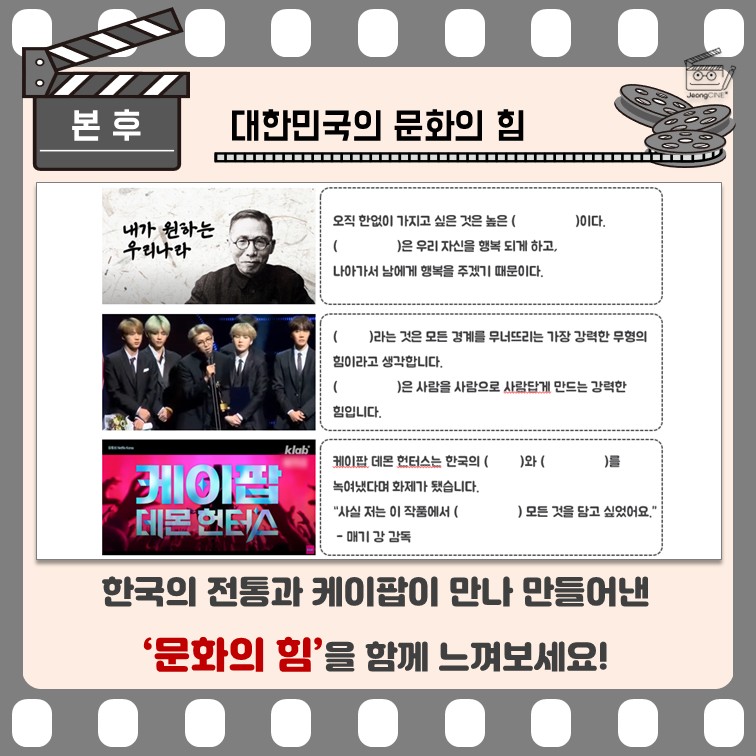 이 영화는 대한민국의 문화의 힘을 보여주는 작품입니다.