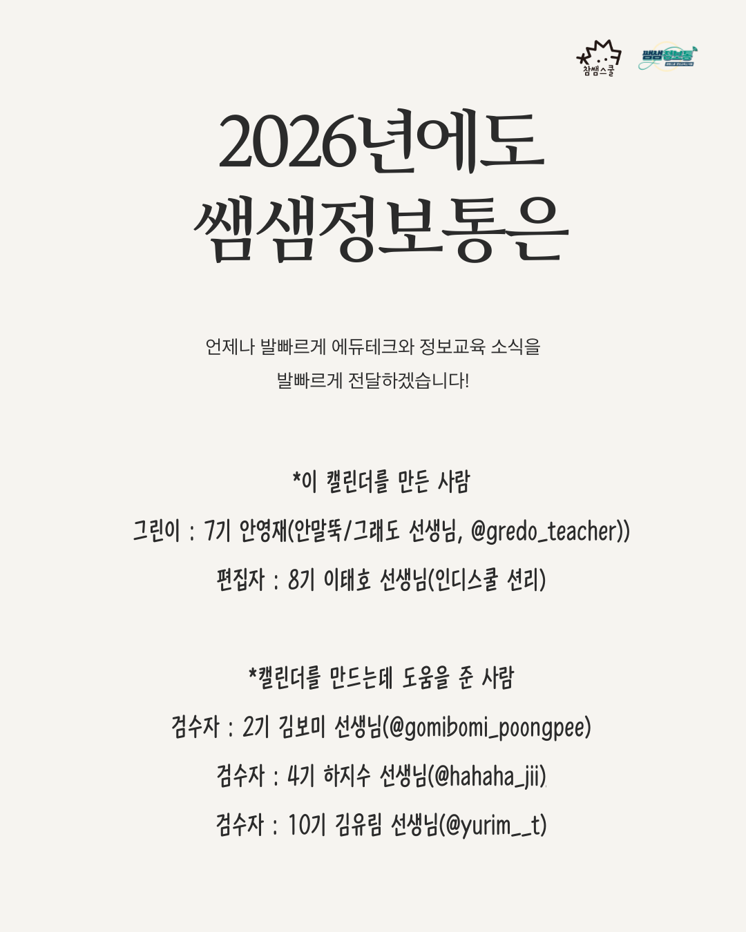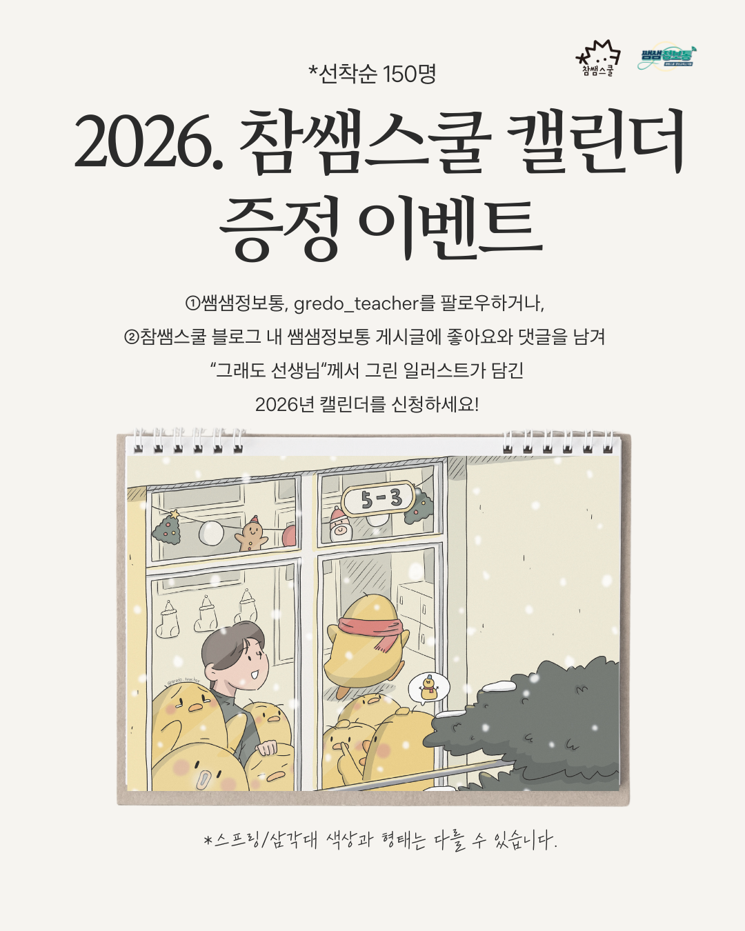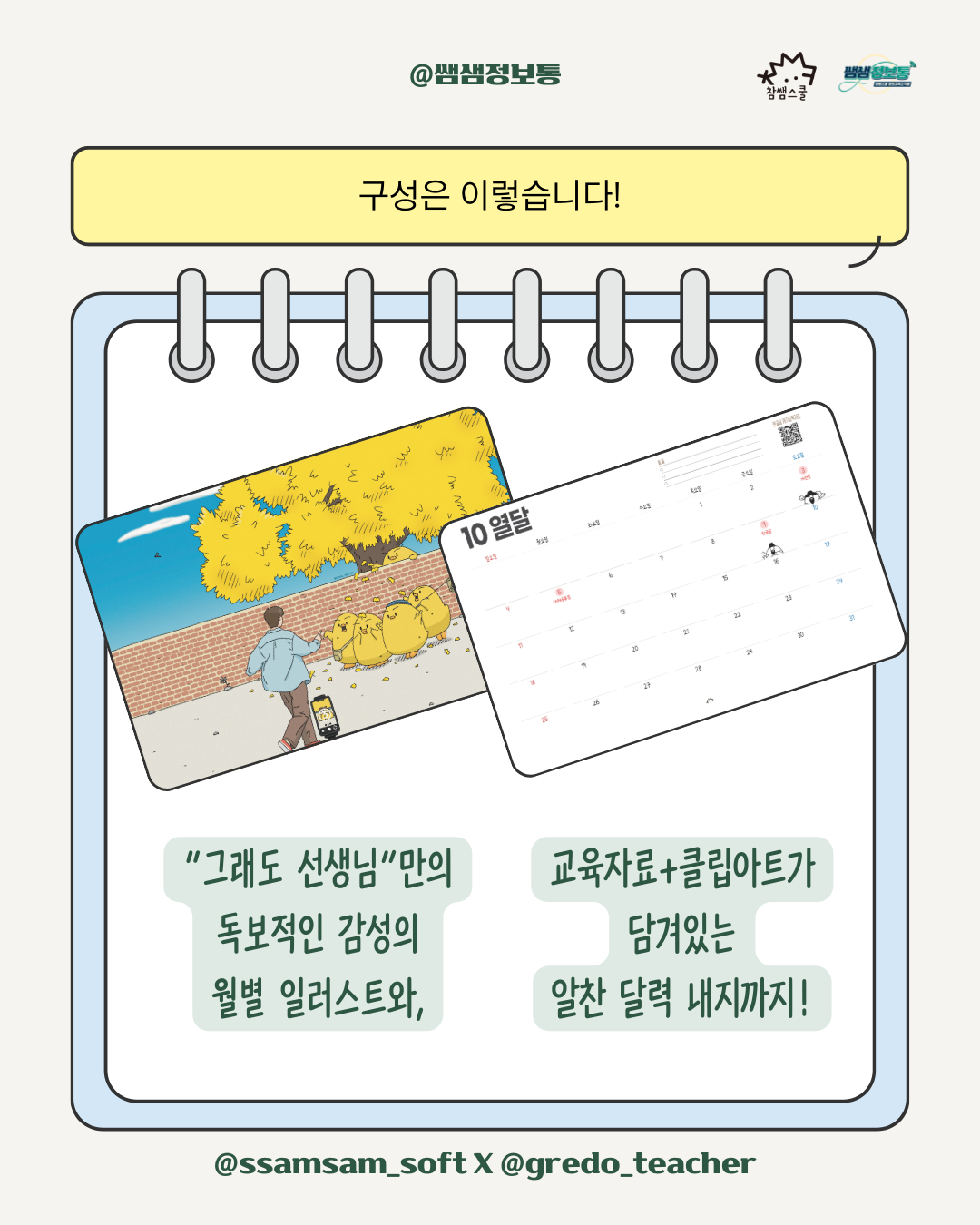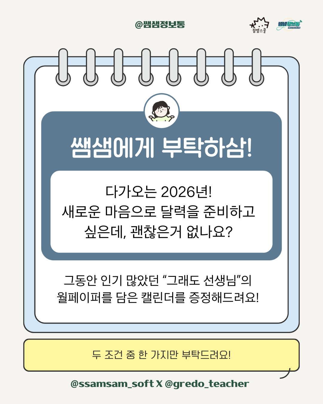 다가오는 2026년, 감성 가득한 “그래도 선생님” 일러스트로 만든 탁상달력 3부를 드립니다! 두 가지 참여 방법 중 하나만 선택해 참여해 주세요 😊 1. 인스타그램에서 @ssamsam_soft, @gredo_teacher, @쌤샘정보통 팔로우 또는 2. 참쌤스쿨 블로그의 쌤샘정보통 게시물에 좋아요 + 댓글 참여 후 설문에 성함/주소 작성하면 끝! 설문조사 링크 : https://naver.me/5yWMbuMa월별 일러스트, 교육자료+클립아트, 휴일 클립아트까지 알찬 구성으로 준비했어요 ✨ 2026년, 쌤샘정보통이 더욱 빠르게 에듀테크 & 정보교육 소식을 전하겠습니다!