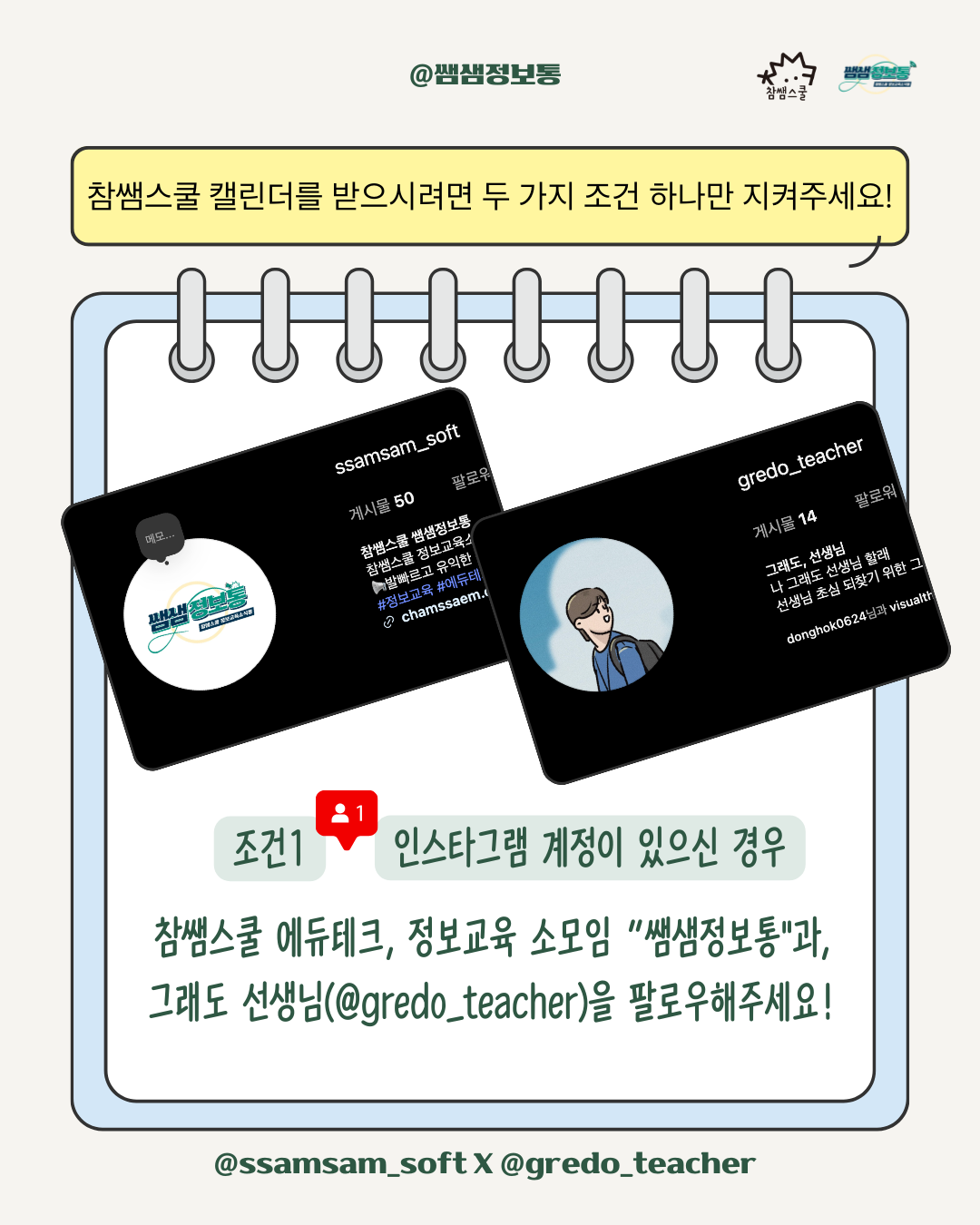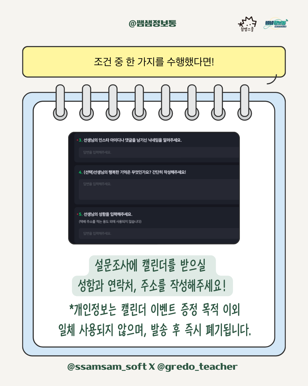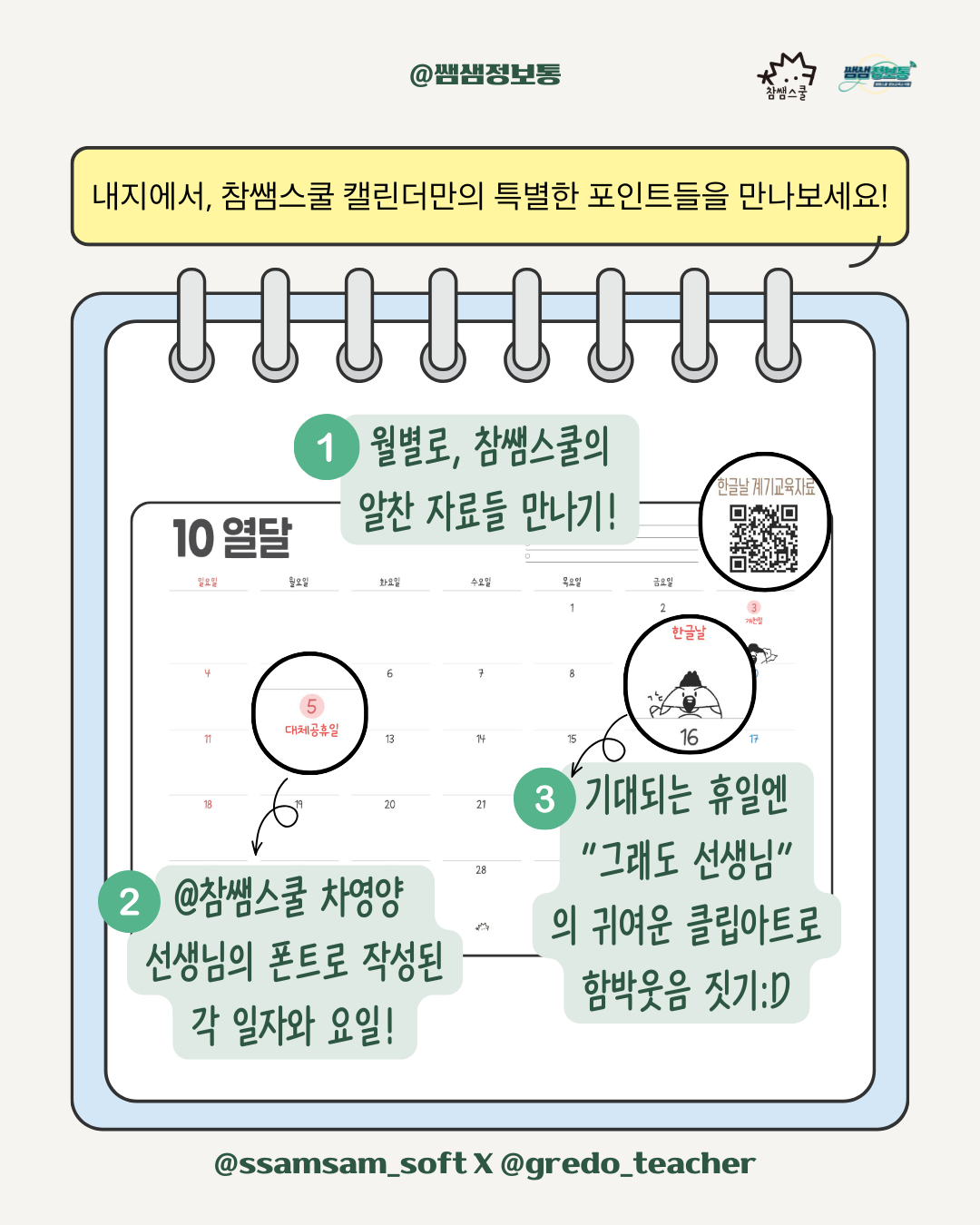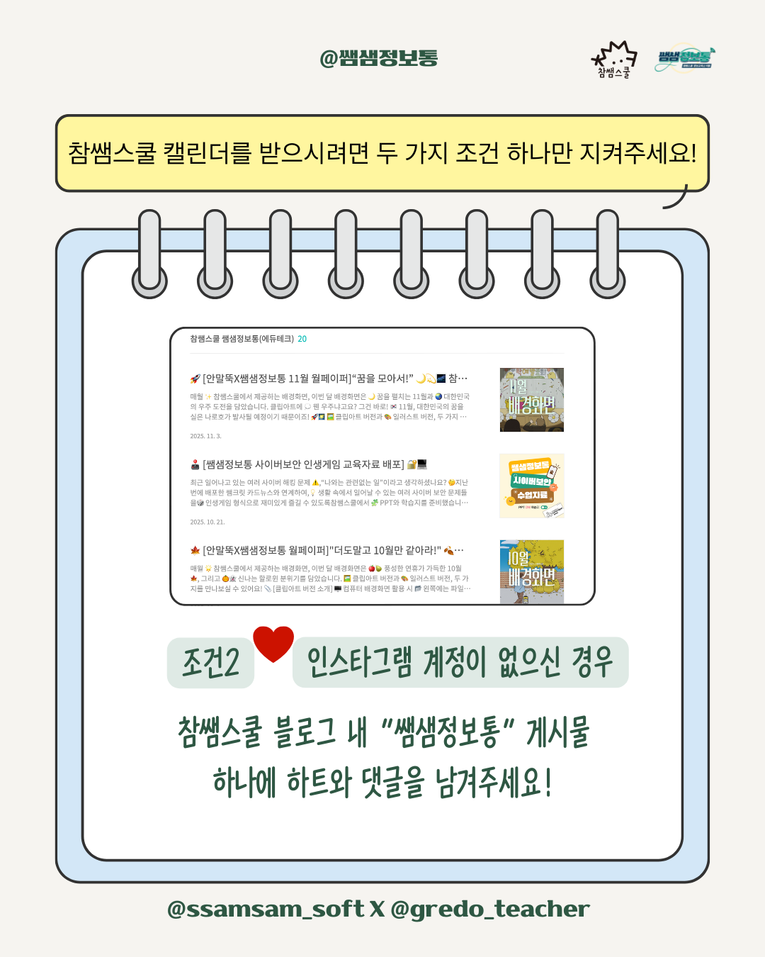 다가오는 2026년, 감성 가득한 “그래도 선생님” 일러스트로 만든 탁상달력 3부를 드립니다! 두 가지 참여 방법 중 하나만 선택해 참여해 주세요 😊 1. 인스타그램에서 @ssamsam_soft, @gredo_teacher, @쌤샘정보통 팔로우 또는 2. 참쌤스쿨 블로그의 쌤샘정보통 게시물에 좋아요 + 댓글 참여 후 설문에 성함/주소 작성하면 끝! 설문조사 링크 : https://naver.me/5yWMbuMa월별 일러스트, 교육자료+클립아트, 휴일 클립아트까지 알찬 구성으로 준비했어요 ✨ 2026년, 쌤샘정보통이 더욱 빠르게 에듀테크 & 정보교육 소식을 전하겠습니다!