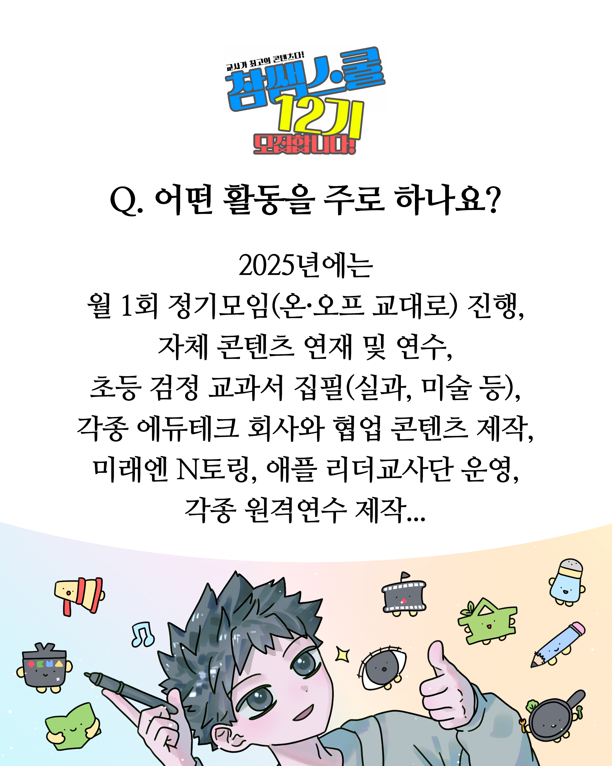 ✨ 참쌤스쿨 12기 모집 안내 ✨ 대한민국 최고의 전문적학습공동체 참쌤스쿨 12기를 모집합니다. 참쌤스쿨은 현재 전국 163명의 선생님이 활동하고 있습니다. 정기모임은 월 1회, 매월 셋째 주 토