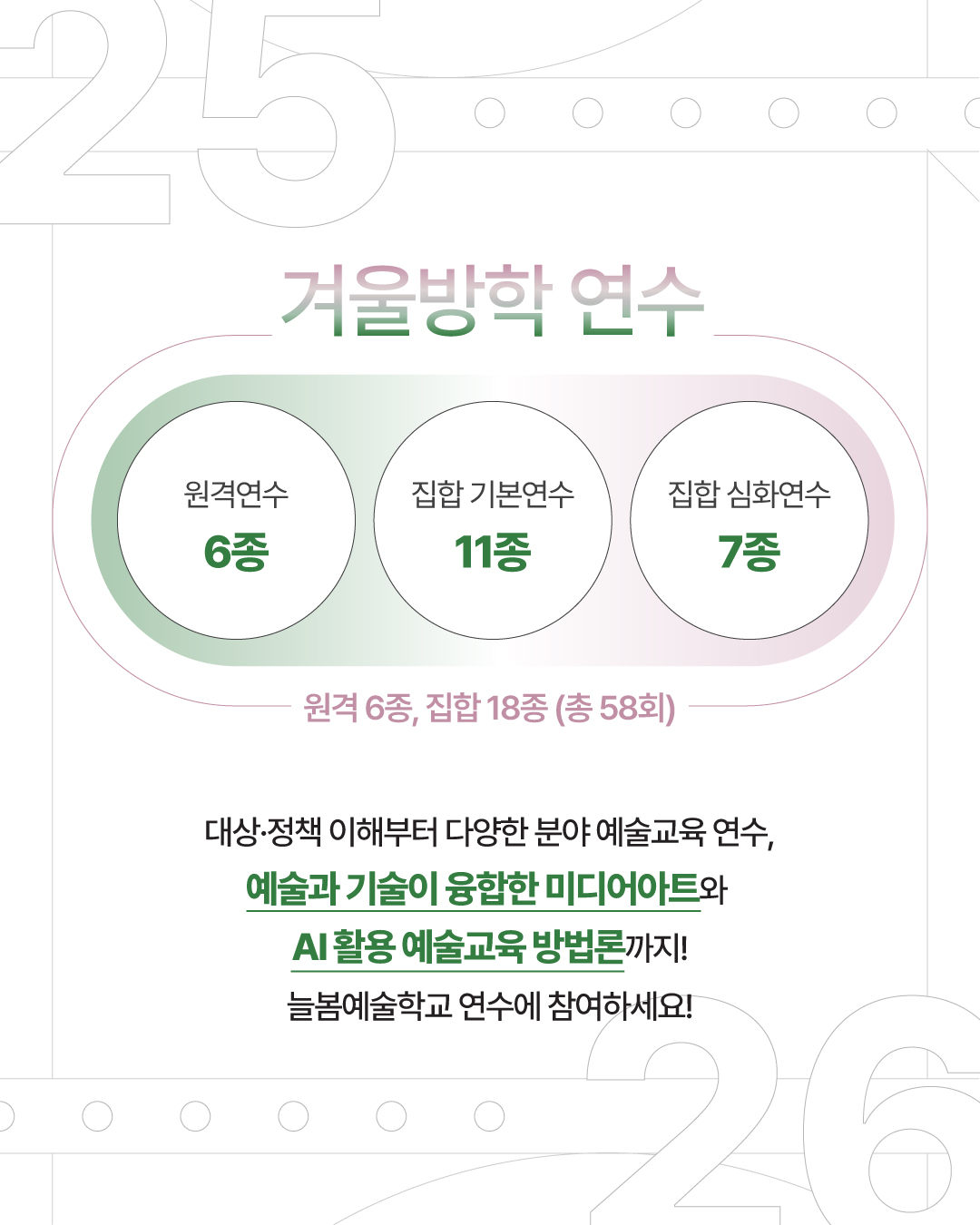 대상·정책 이해부터 다양한 분야 예술교육 연수, 미디어아트·AI 활용 예술교육 방법론까지! 총 58개 과정이 열리는 ✨늘봄예술학교 겨울방학 연수✨에 함께하세요!