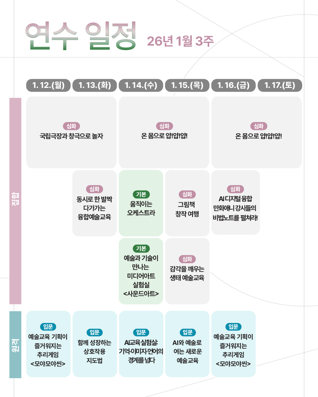 #늘봄학교 #전문인력연수 #늘봄예술학교 #늘봄연수 #예술교육 #학교문화예술교육 #문화예술교육 #한국문화예술교육진흥원 #아르떼 #겨울방학 #ARTE #동시 #만화애니 #그림책 #국립현대무용단 #간송미술관 #국립어린이박물관 #전통예술 #디자인 #늘봄학교연수 #오케스트라 #기술융합