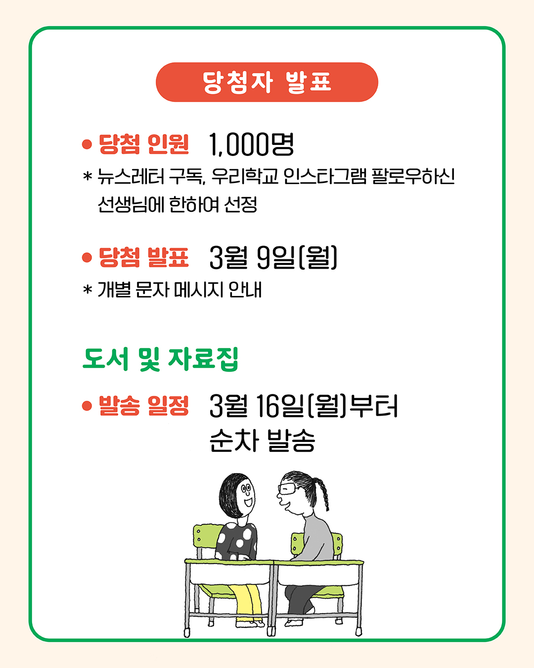 뉴스레터 구독 + 인스타 팔로우하신 선생님 중 선정 - 당첨 발표: 3월 9일(월) 개별 문자 안내