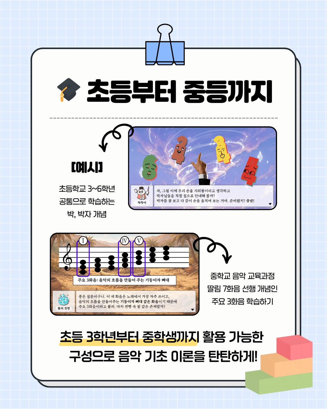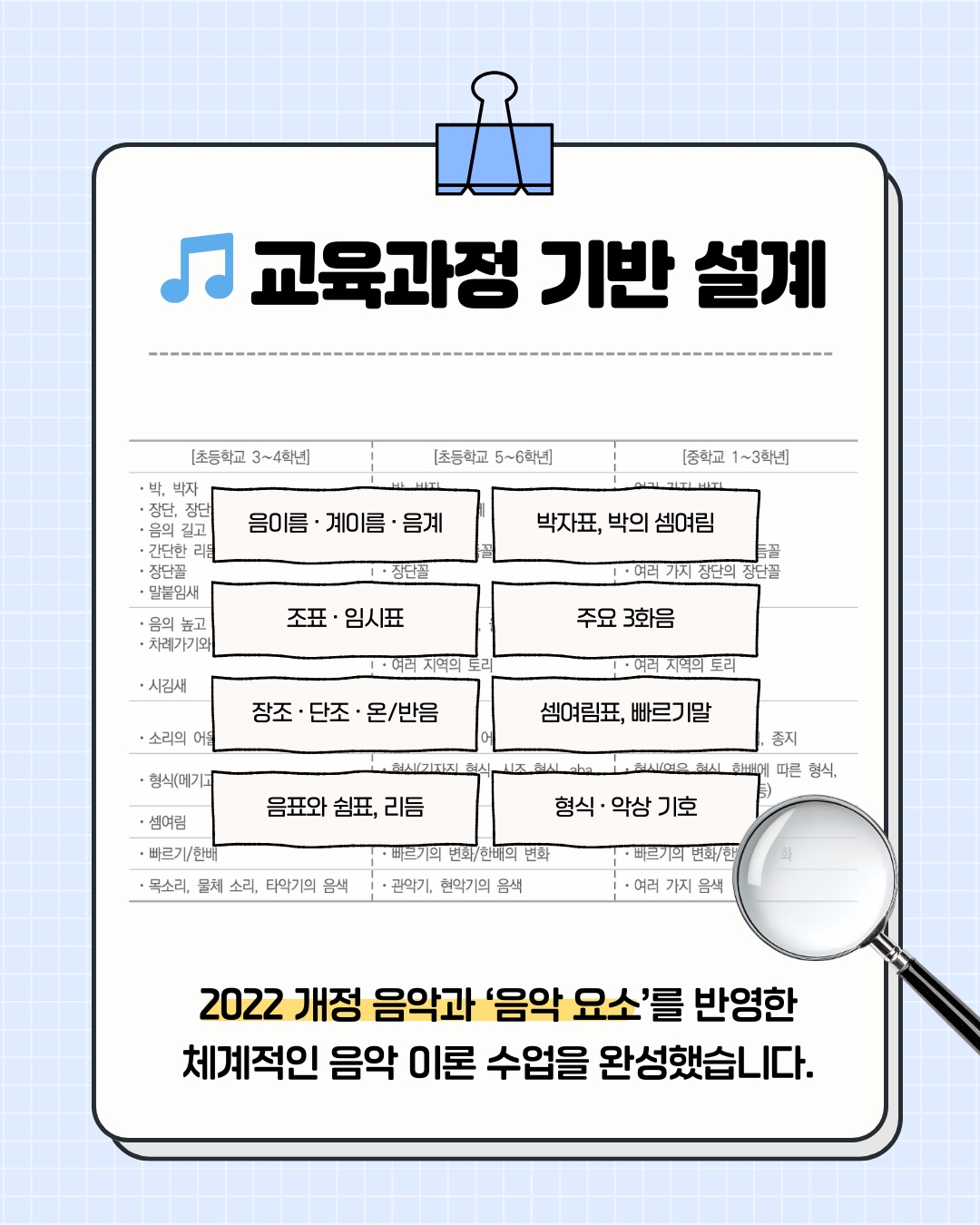 📚2022 개정 교육과정 ‘음악요소’ 반영! 음계, 조표, 장단조, 음표와 쉼표, 리듬, 박자, 화음, 셈여림, 빠르기말, 형식, 악상기호 등 필수로 알아야 하는 음악 이론 기초를 모두 반영하였습니다.