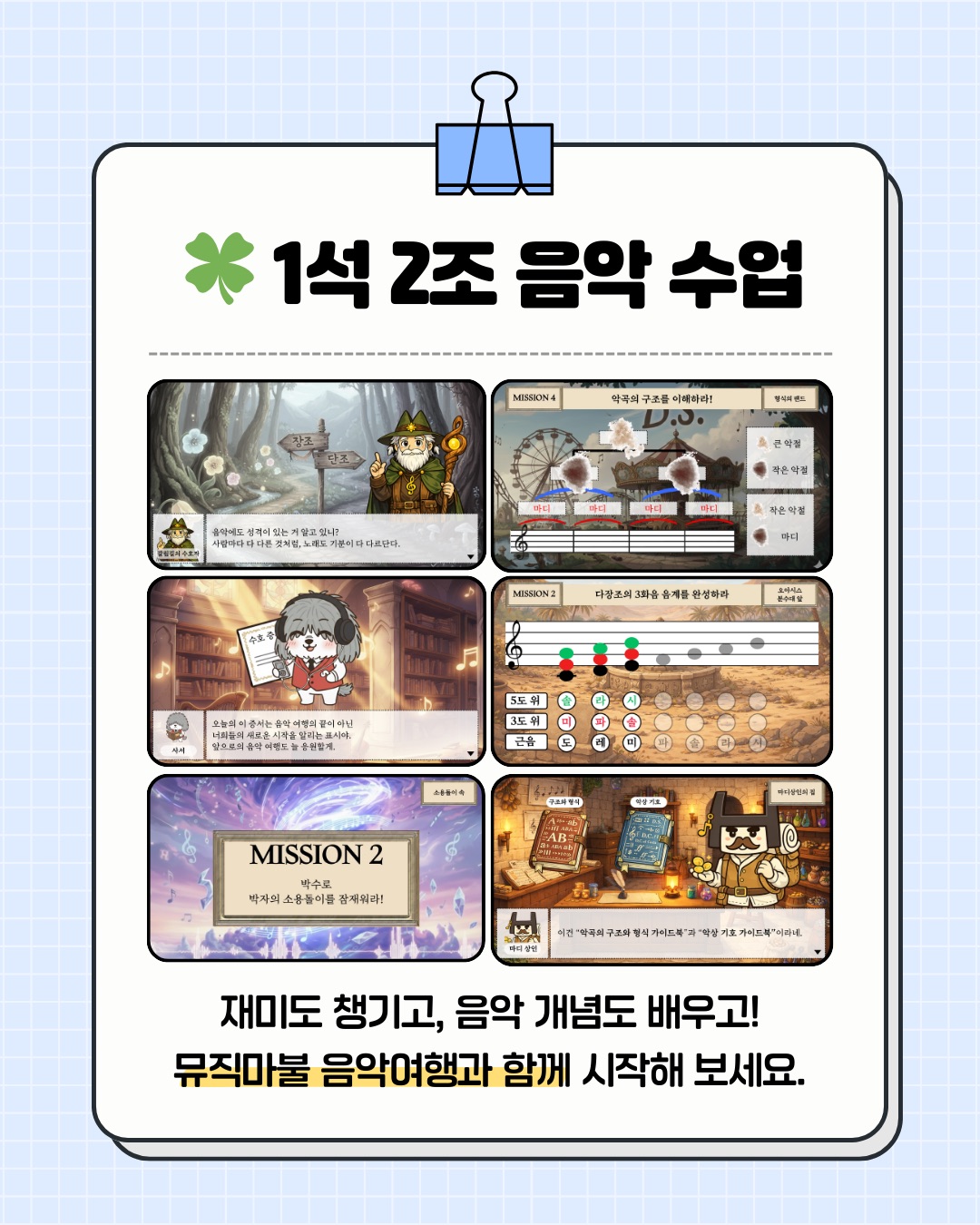 🎮 차시마다 퀘스트를 깨며 배우는 스토리텔링형 RPG 음악 이론 수업! 차시마다 새로운 주인공들과 스토리가 함께하며 선생님과 학생들에게 즐거운 음악 수업을 선물합니다.
